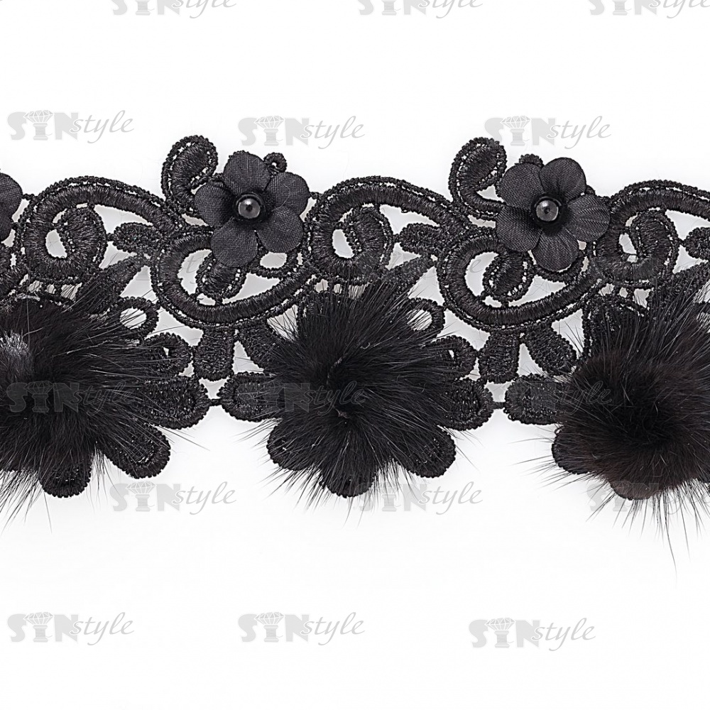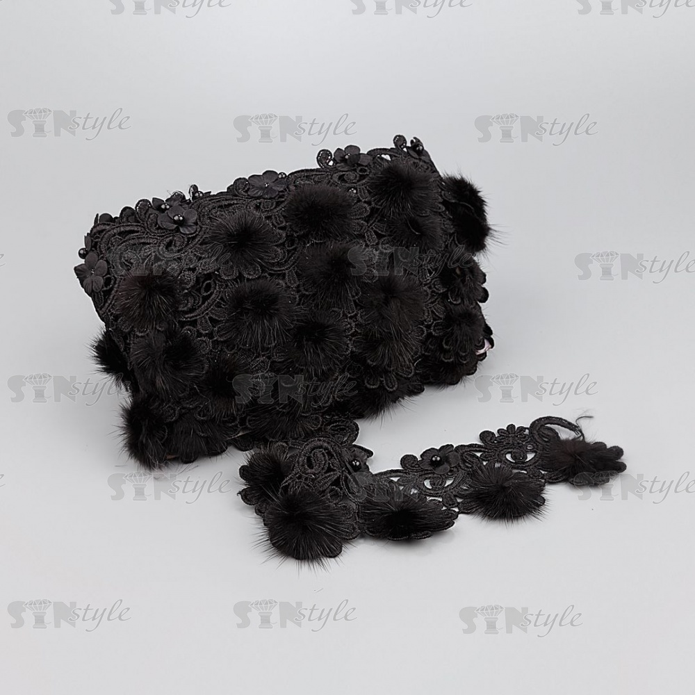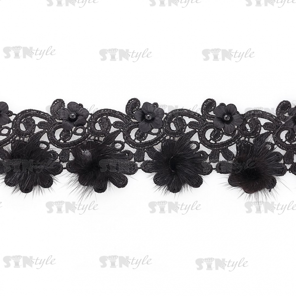 Ажурное кружево с натуральным мехом, цветами и бусинами в цвет кружева, ширина 60 мм, намотка 10 ярдов, цвет черный