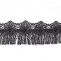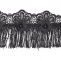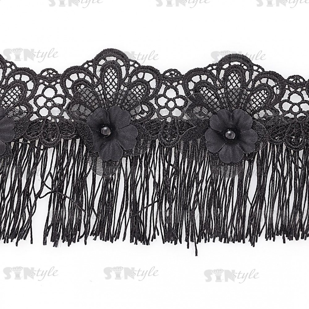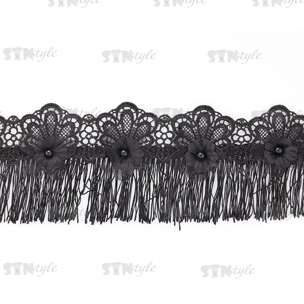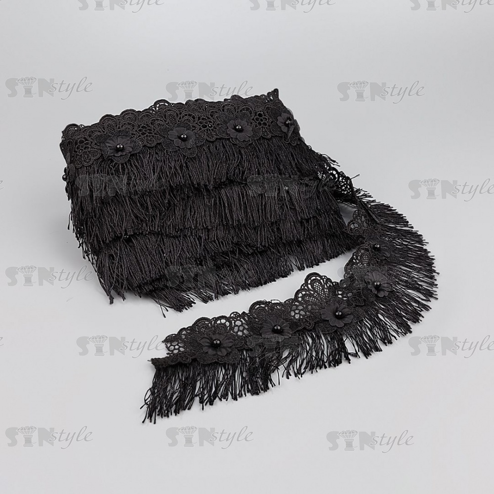 Кружево ажурное с отделкой, на нежной кружевной основе россыпь цветов с бусиной в центре и тонкой бахромой по всей длине, ширина 80 мм, намотка 10 ярдов, цвет черный