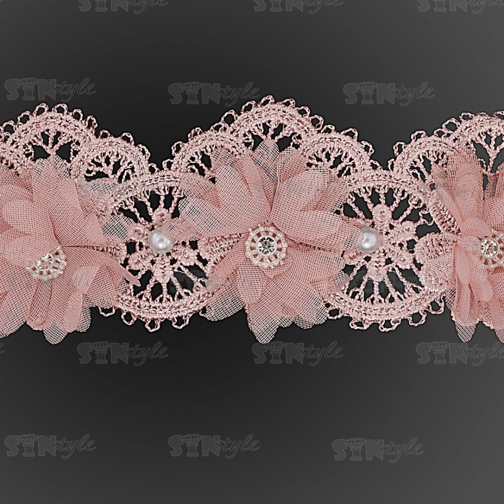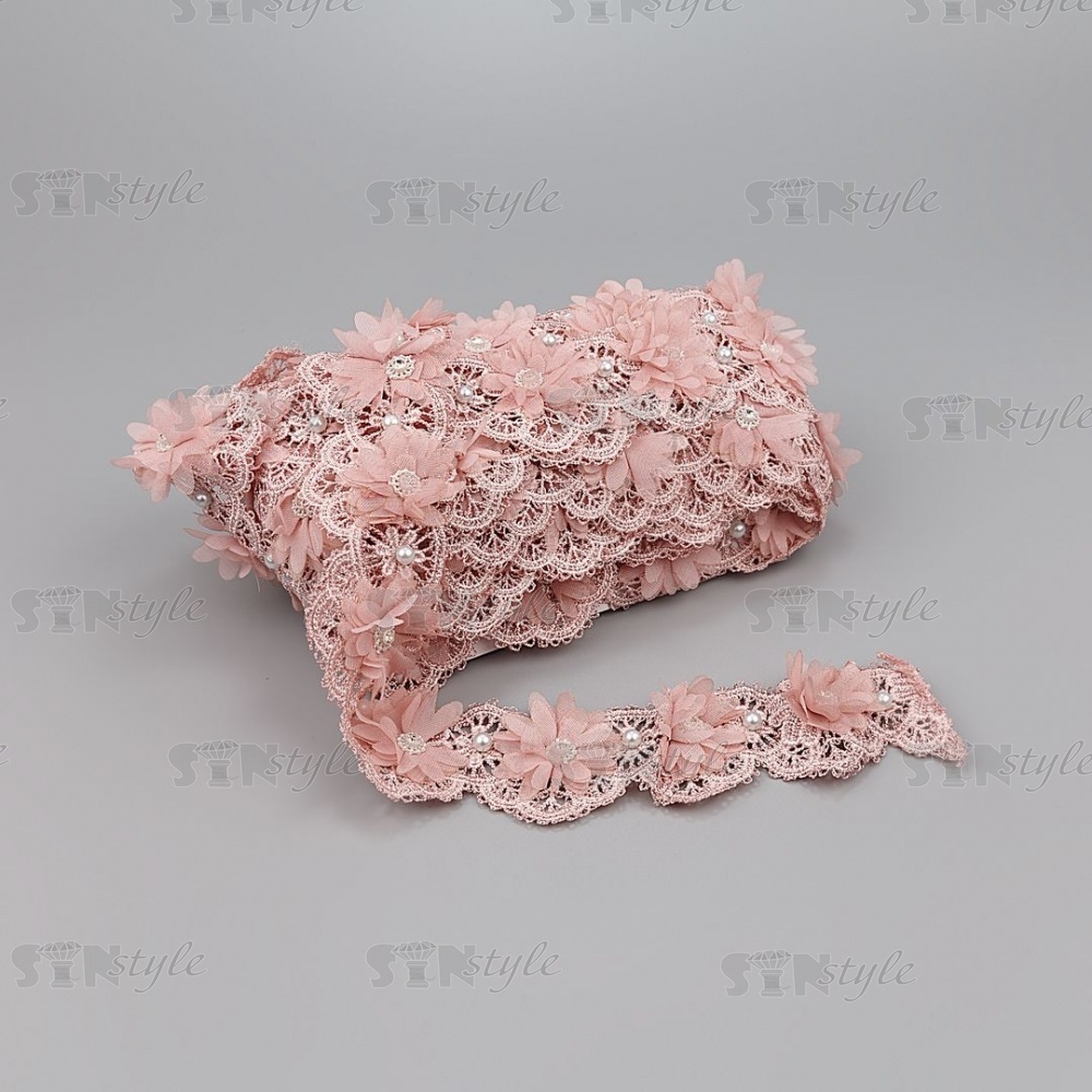 Кружево ажурное с объемными цветами в цвет кружева, украшено белыми бусинами и стразами, ширина 50 мм, намотка 10 ярдов, цвет грязно-розовый