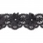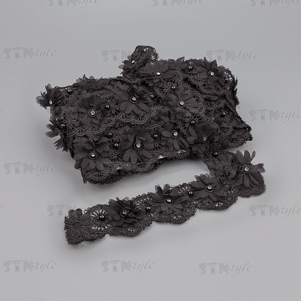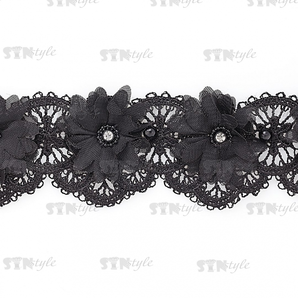 Кружево ажурное с объемными цветами в цвет кружева, украшено черными бусинами и белыми стразами, ширина 50 мм, намотка 10 ярдов, цвет черный
