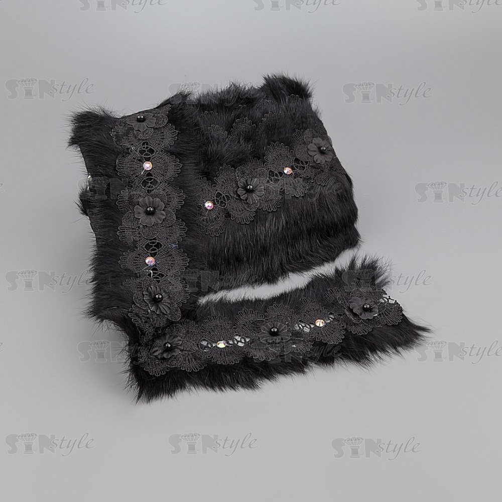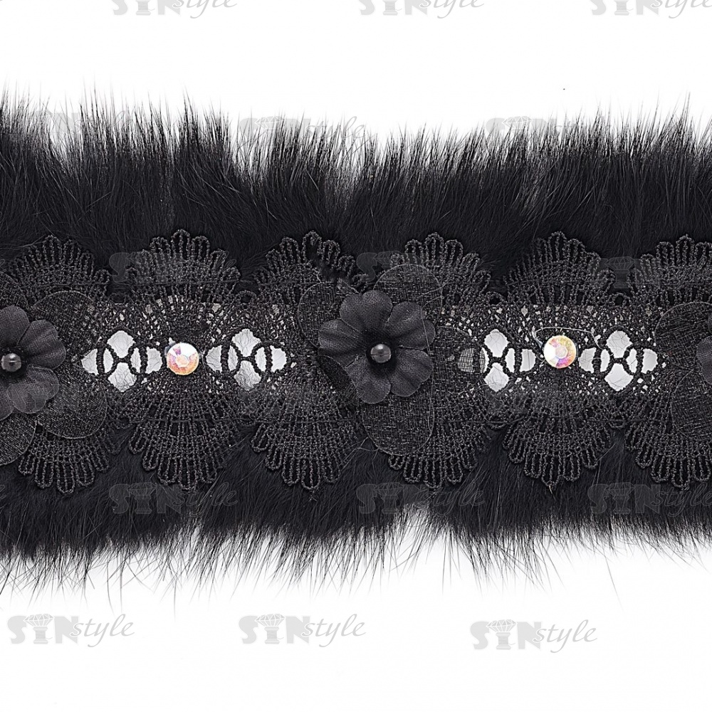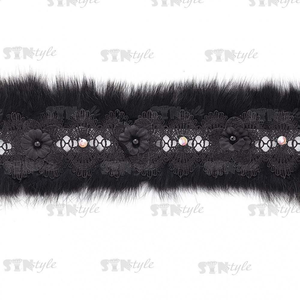 Ажурное кружево, отделанное натуральным мехом, украшенное цветочками и бусинами в цвет кружева, намотка 10 ярдов, ширина 70 мм, цвет черный