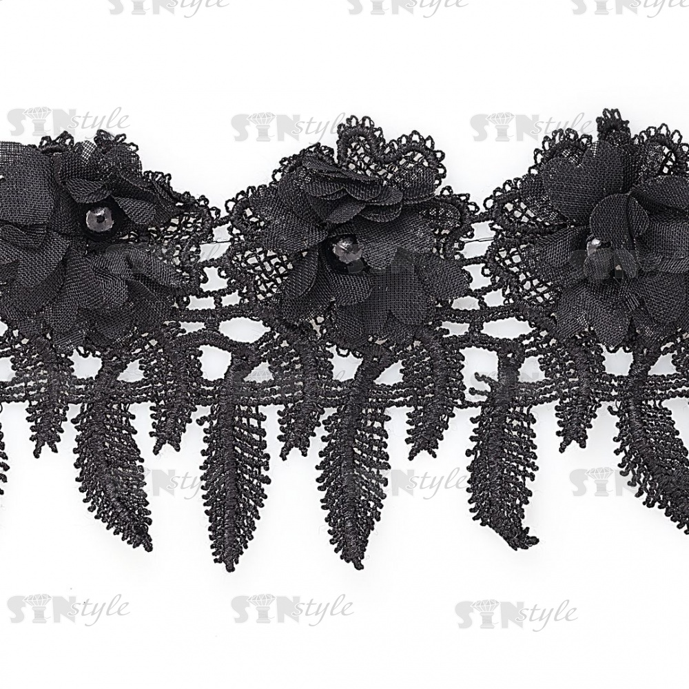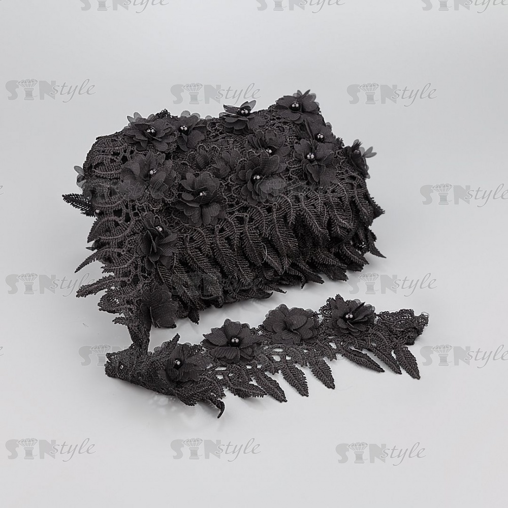Кружево ажурное с отделкой, нежнейшее тонкое переплетение гирлянды с цветочными мотивами с бусиной в центре цветка, ширина 85 мм, намотка 10 ярдов, цвет черный
