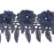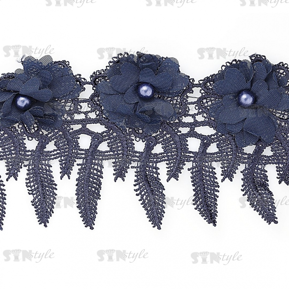 Кружево ажурное с отделкой, нежнейшее тонкое переплетение гирлянды с цветочными мотивами с бусиной в центре цветка, ширина 85 мм, намотка 10 ярдов, цвет темно-синий