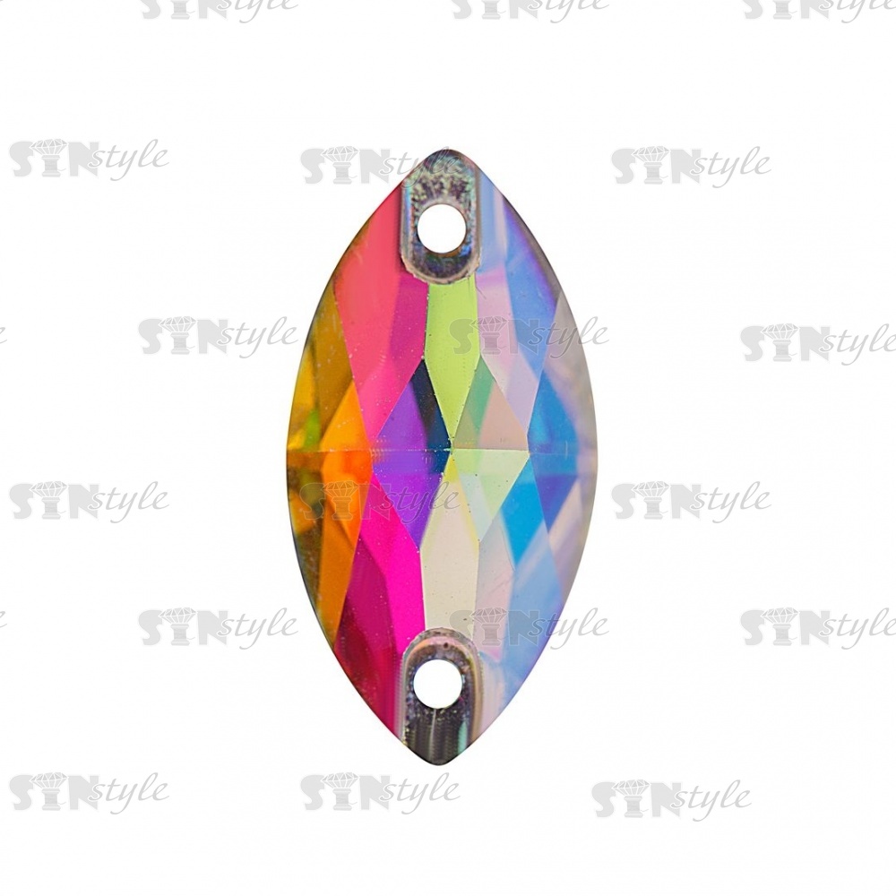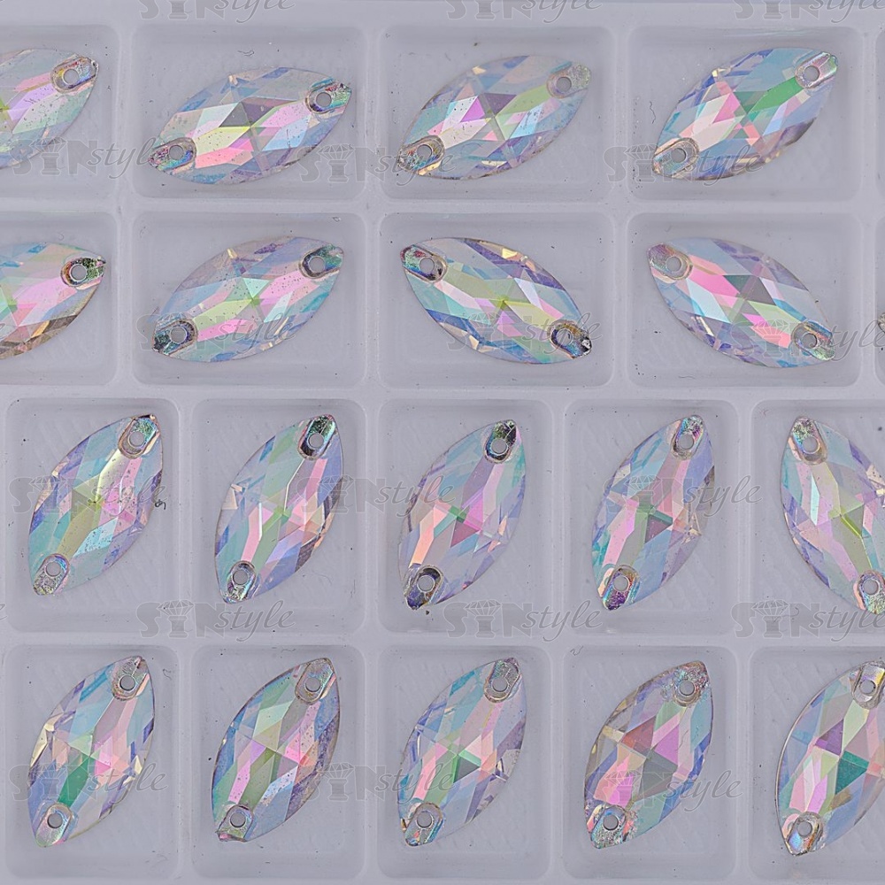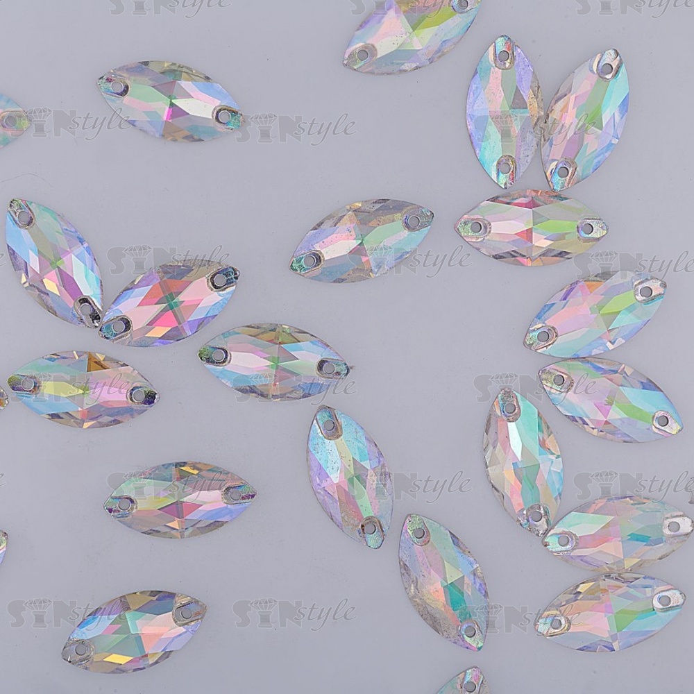 Стразы пришивные стеклянные, форма лодочка, цвет радужный (голография), размер 10 мм х 19 мм