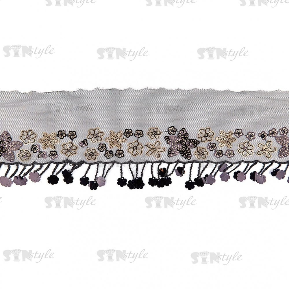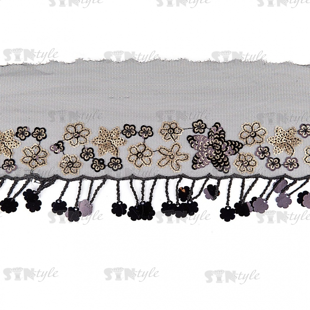 Декоративная тесьма на сетке, расшитая пайетками, ширина 70 мм, цвет черный+золотой, намотка 16 ярдов