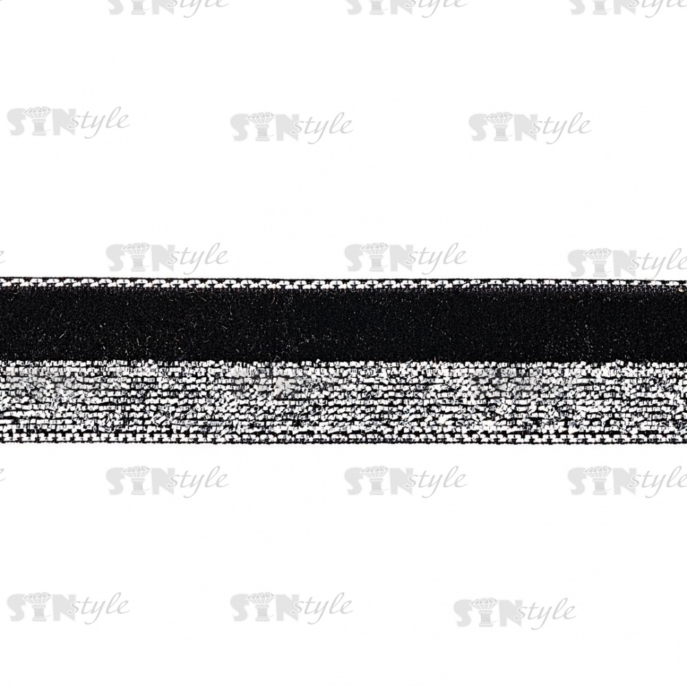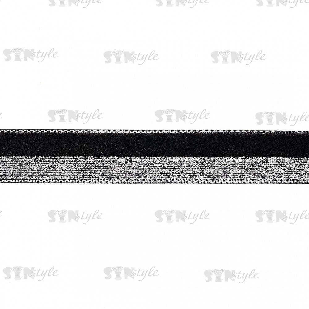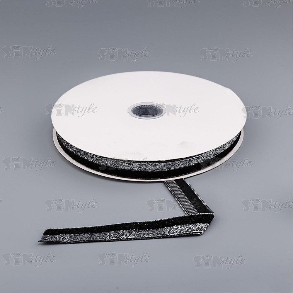 Лента бархатная с люрексом, ширина 15 мм, цвет черный+серебряный, намотка 25 ярдов