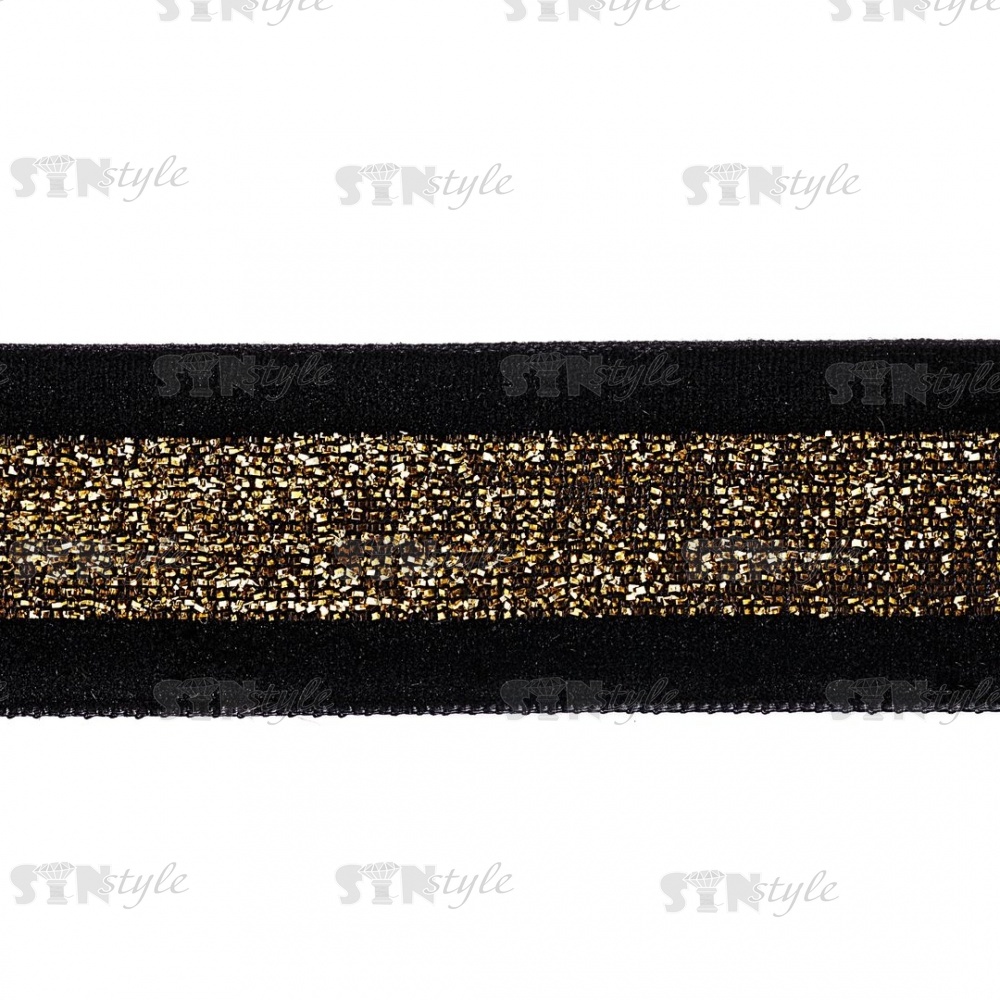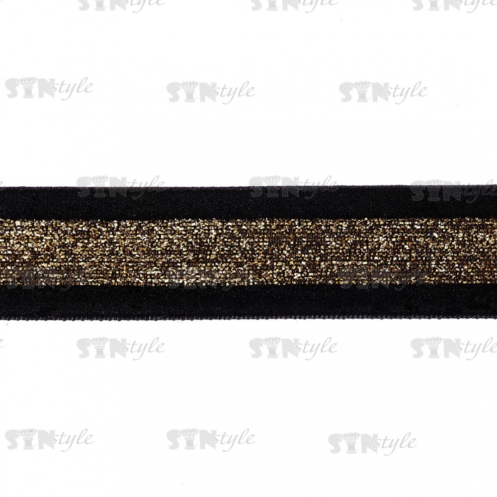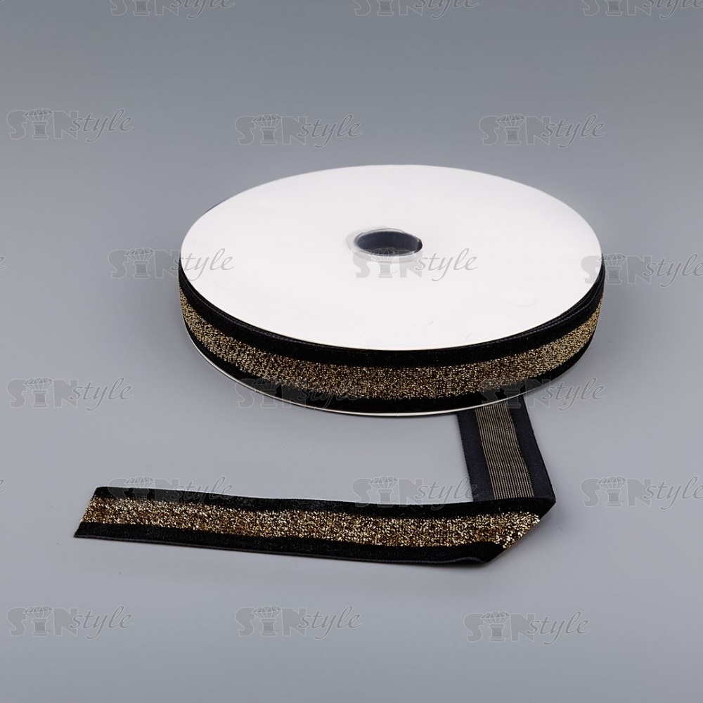 Лента бархатная с люрексом, ширина 25 мм, цвет черный+золотой, намотка 25 ярдов