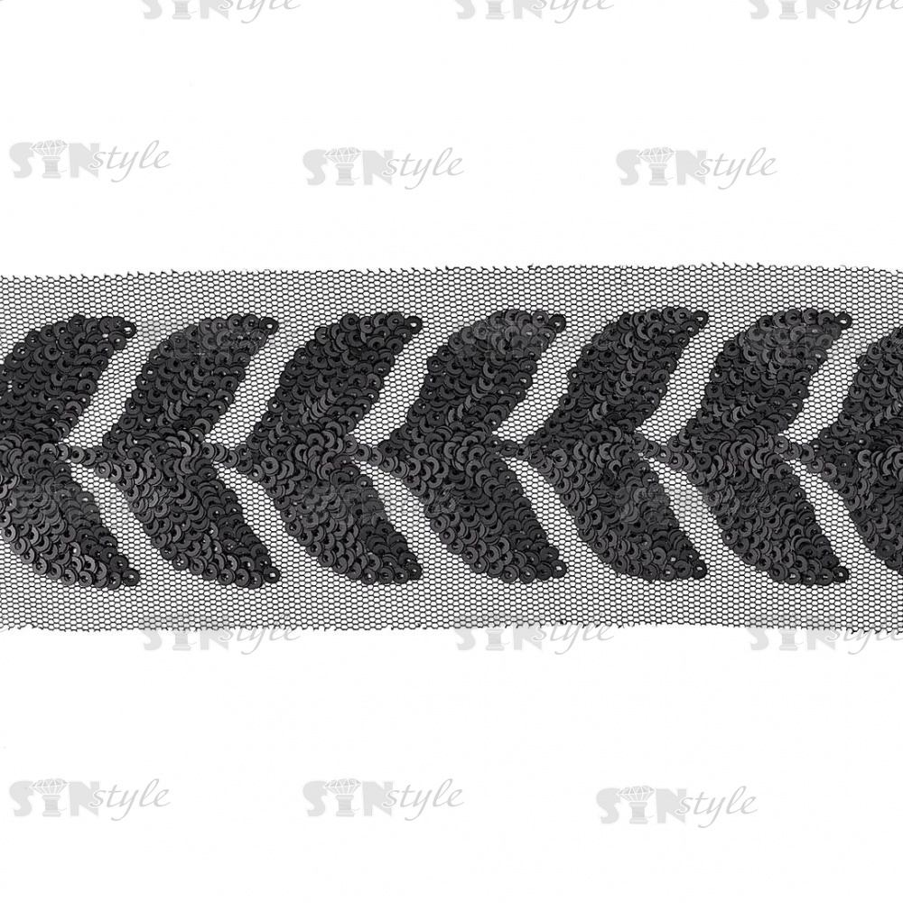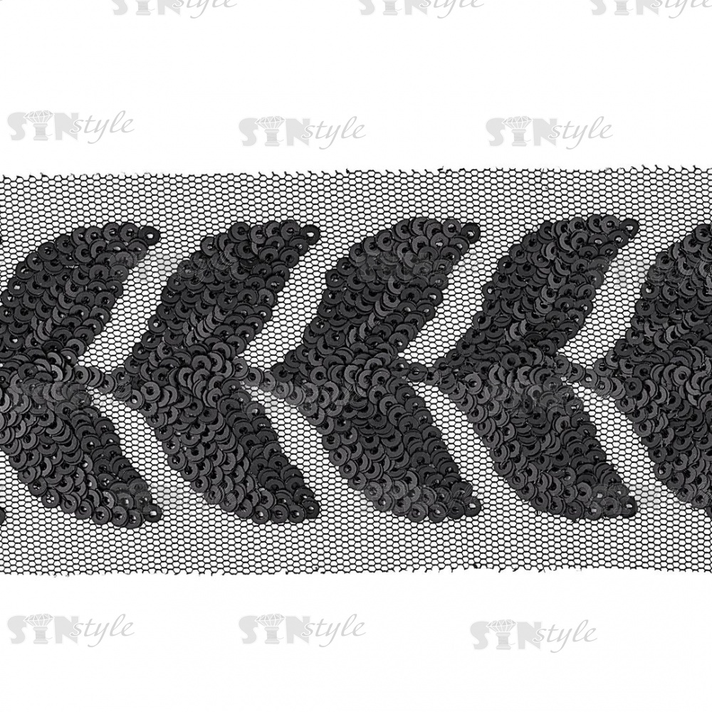 Тесьма отделочная на черной сетке, расшитая пайетками черного цвета, ширина 50 мм, намотка 20 ярдов