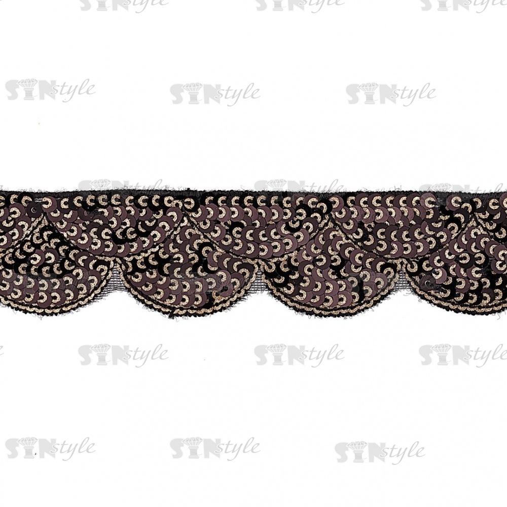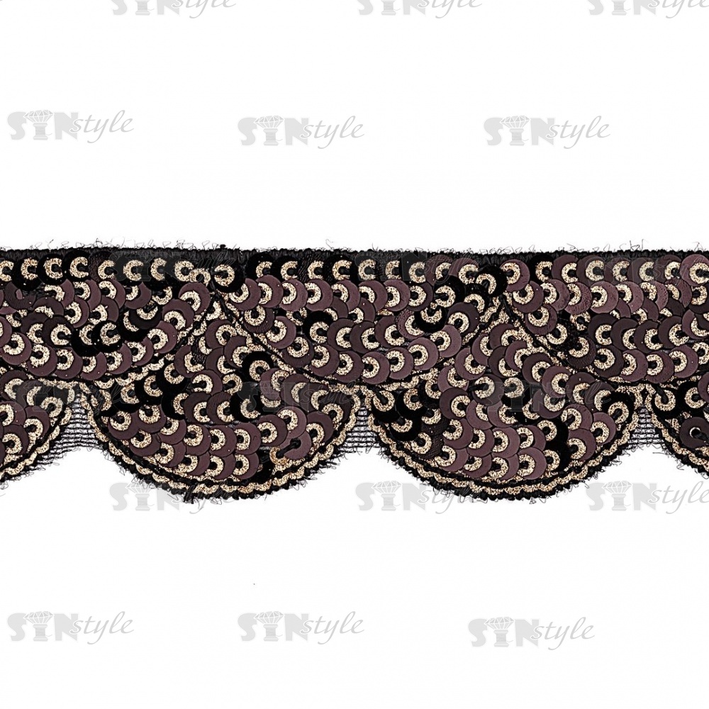 Декоративная тесьма на сетке, расшитая пайетками, ширина 35 мм, цвет черный+золотой, намотка 20 ярдов