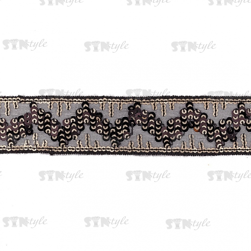 Тесьма отделочная на сетке черного цвета, расшита черными и золотыми пайетками, ширина 35 мм, намотка 20 ярдов