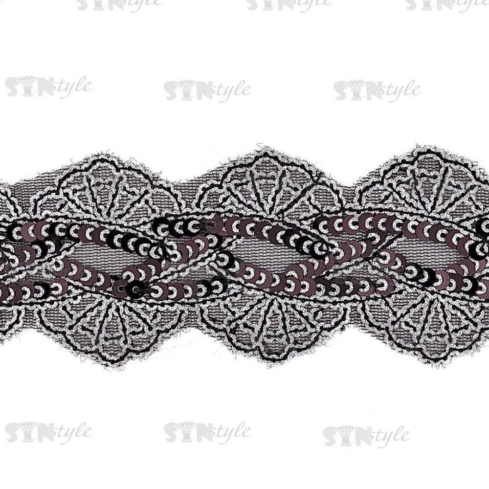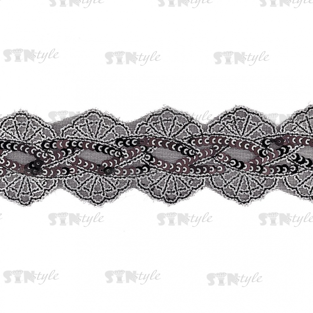 Декоративная тесьма на черной сетке, расшитая черными и серебряными пайетками, ширина 55 мм, намотка 20 ярдов
