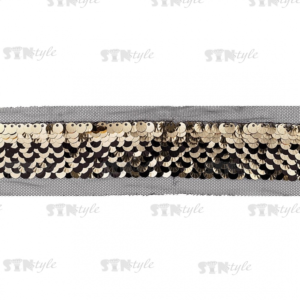Тесьма отделочная на сетке, расшитая пайетками, цвет золотой, ширина участка с пайетками 30 мм, намотка 22 ярда