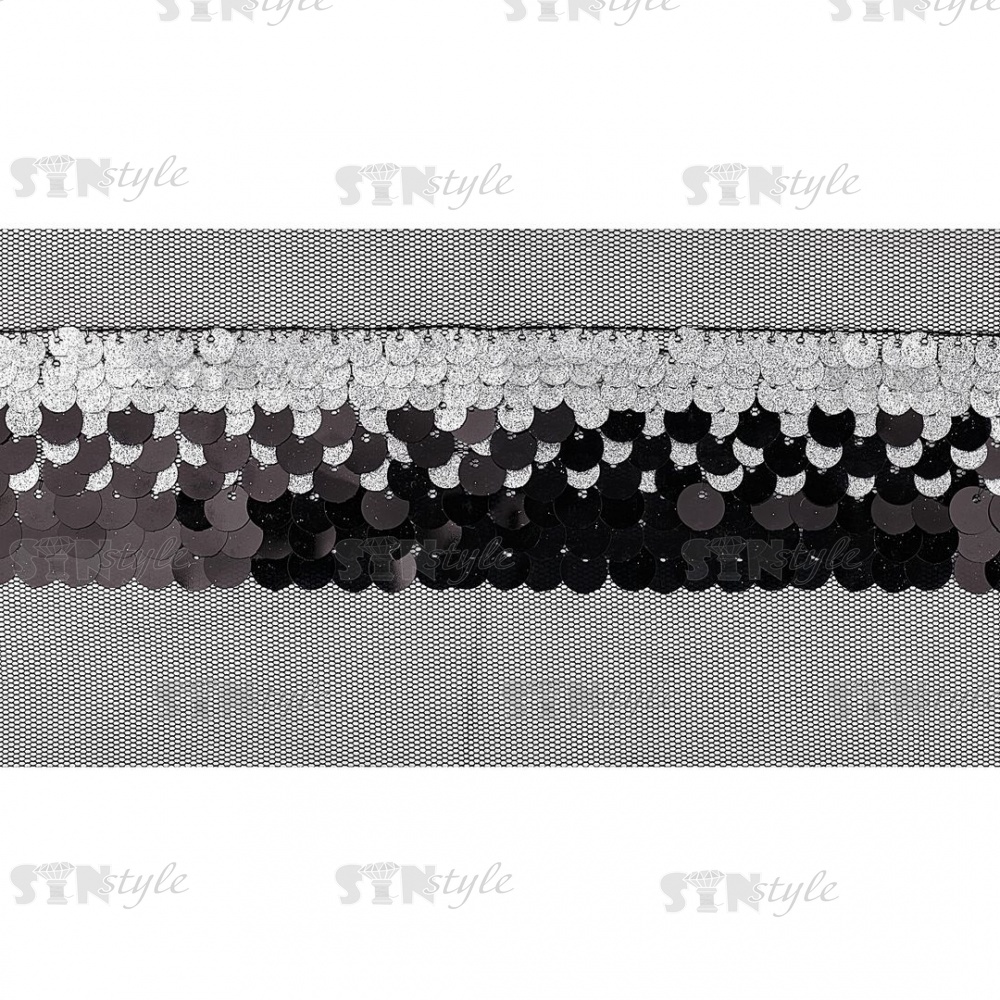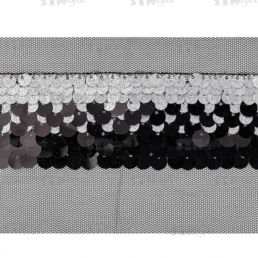 Тесьма из пайеток на сетке, цвет черный+серебряный, ширина 45 мм, намотка 16 ярдов