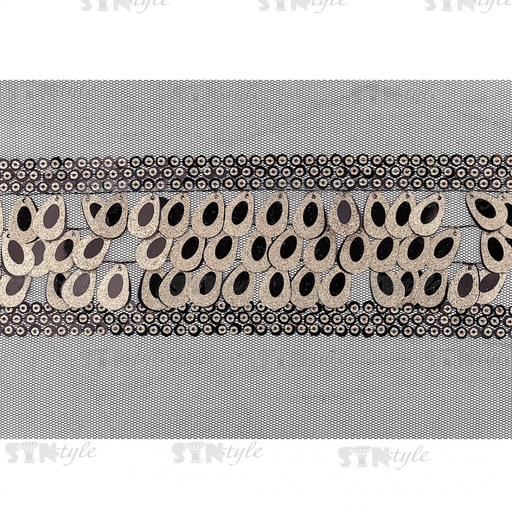Тесьма из пайеток на сетке, цвет черный+золотой, ширина 60 мм, намотка 16 ярдов