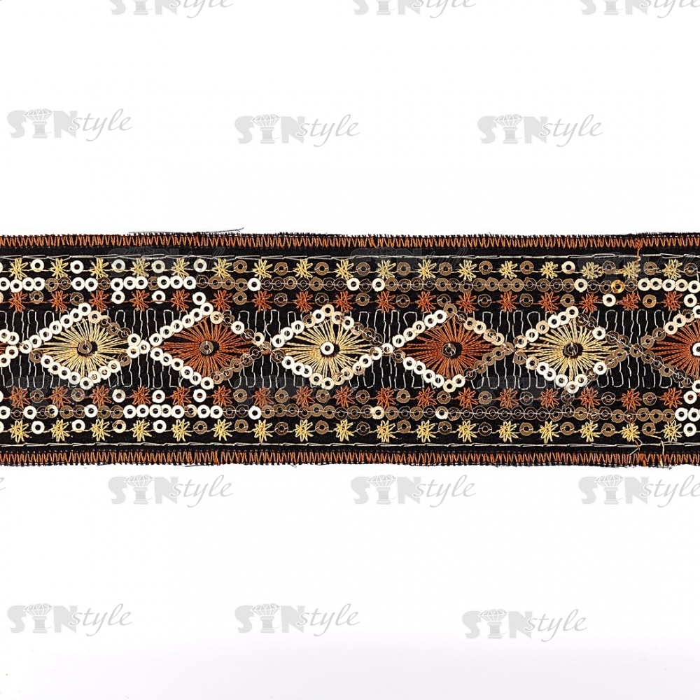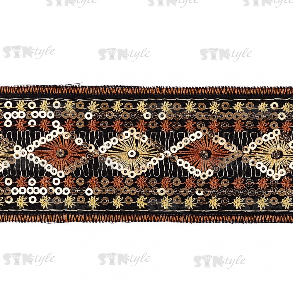 Тесьма отделочная на сетке, расшитая пайетками, цвет черный+золотой+коричневый, ширина 50 мм, намотка 10 ярдов
