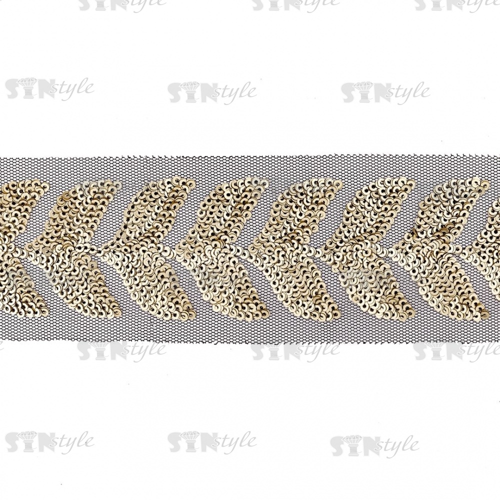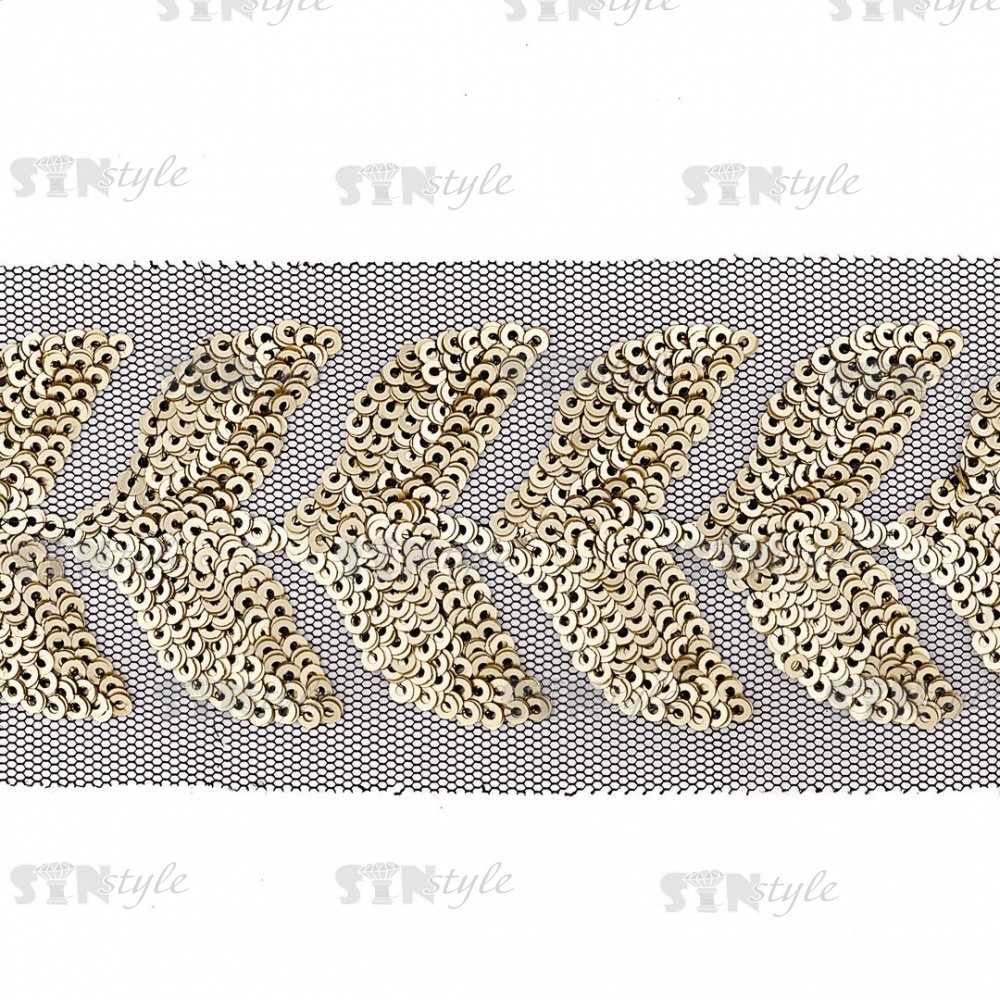 Тесьма отделочная на черной сетке, расшитая золотыми пайетками, ширина 50 мм, намотка 20 ярдов