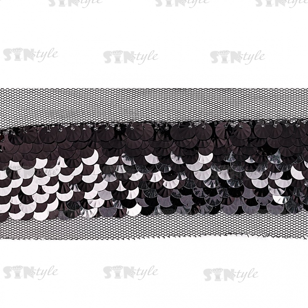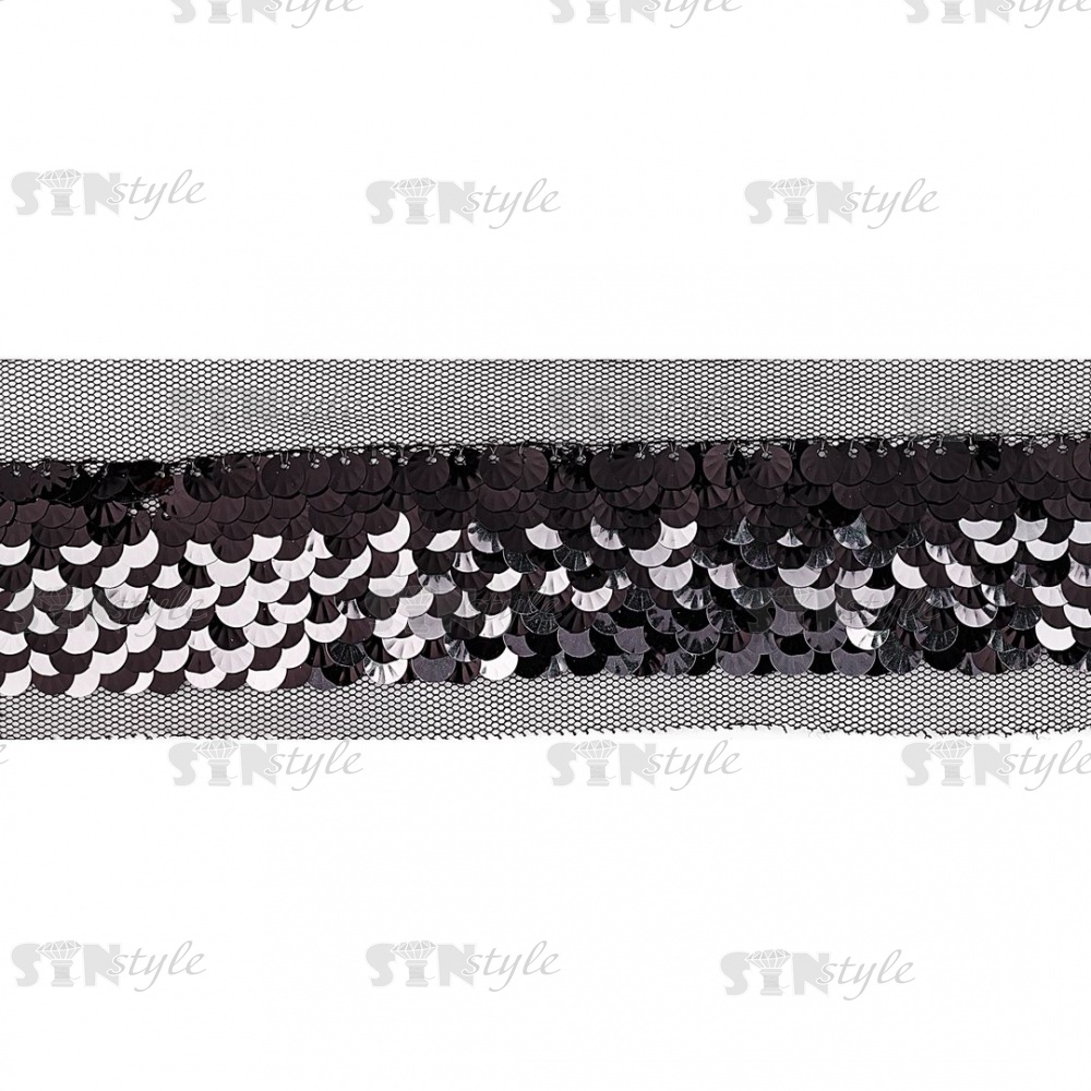 Тесьма отделочная на сетке, расшитая пайетками, цвет серебряный, ширина участка с пайетками 30 мм, намотка 22 ярда