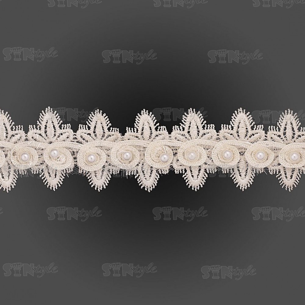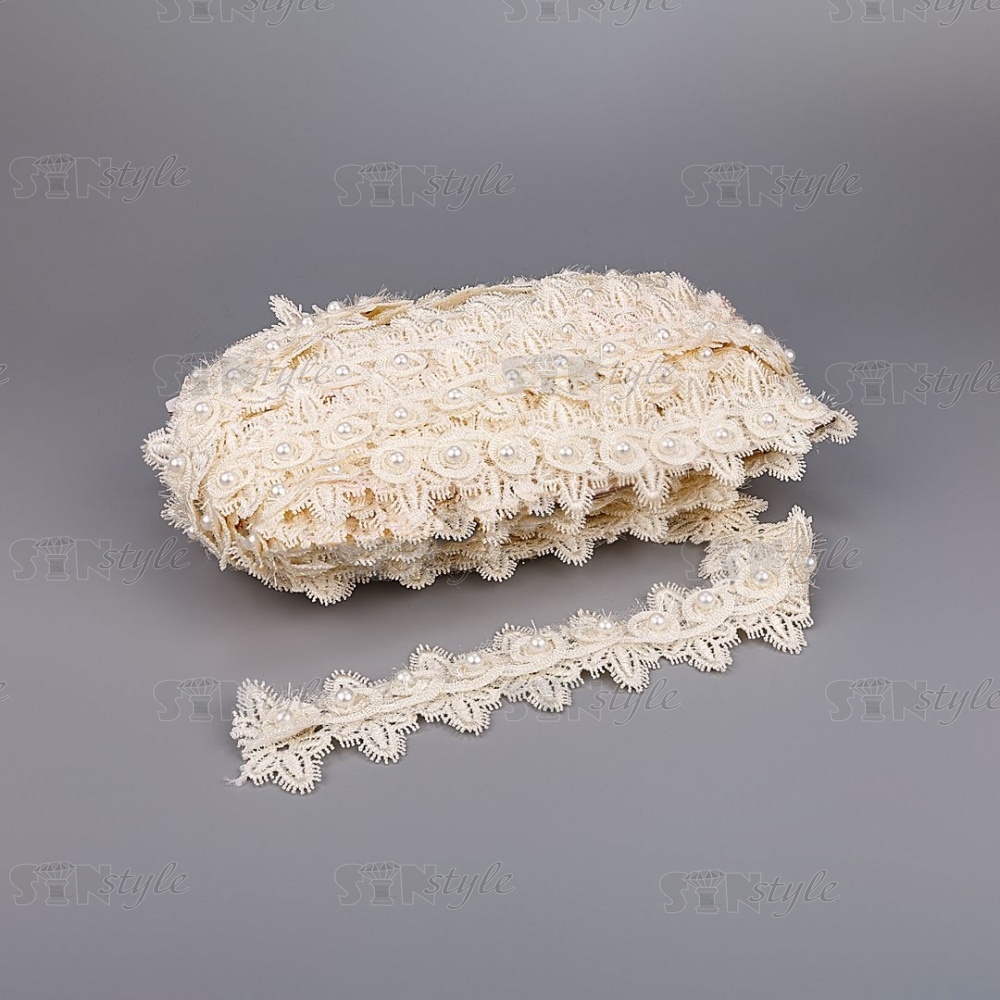 Кружево ажурное с отделкой, на нежной ажурной основе россыпь бутонов розочек с бусиной в середине цветка, ширина 45 мм, намотка 15 ярдов, цвет шампань