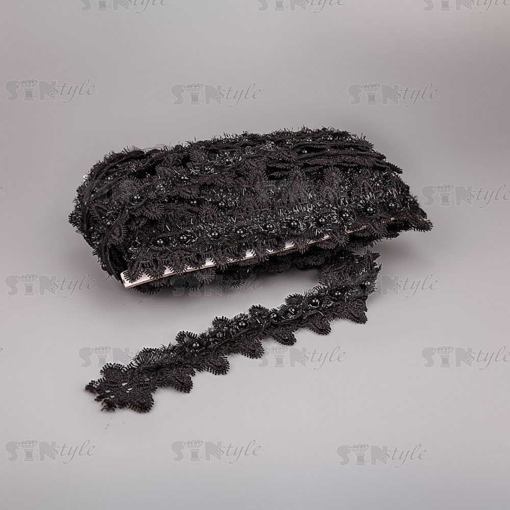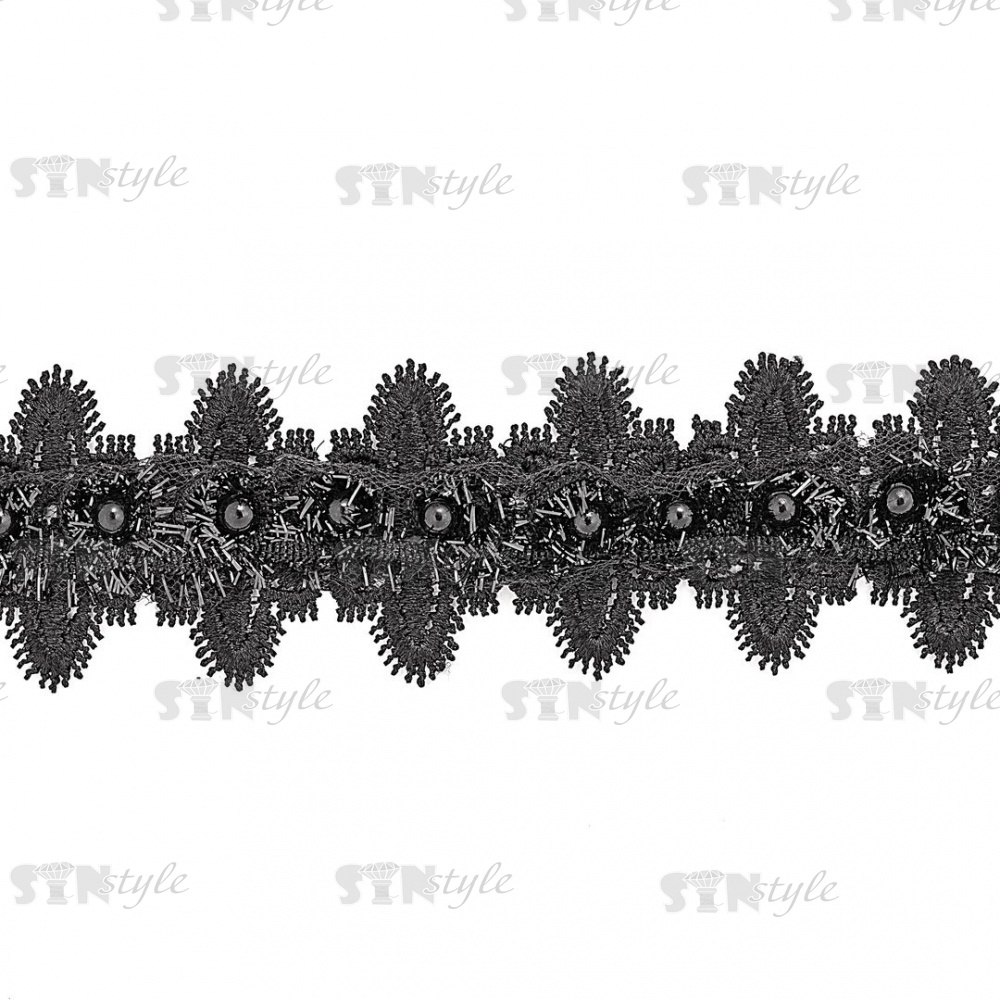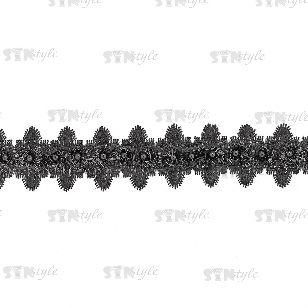 Кружево ажурное с отделкой, на нежной ажурной основе россыпь бутонов розочек с бусиной в середине цветка, ширина 45 мм, намотка 15 ярдов, цвет черный