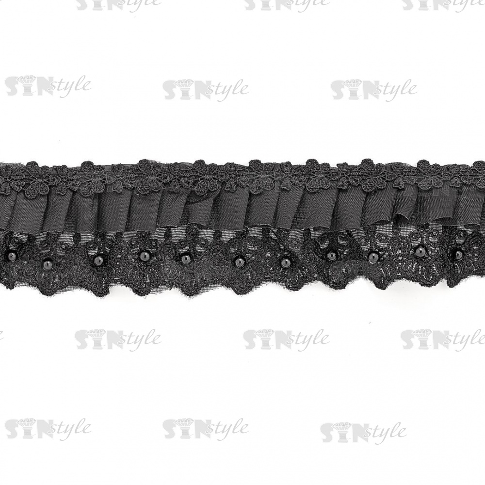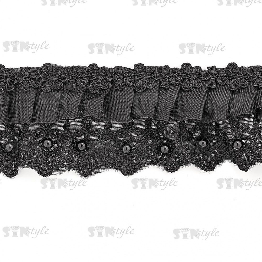 Сборка на кружеве из сетки, декорированная бусинами в цвет кружева, ширина 65 мм, цвет черный, намотка 10 ярдов
