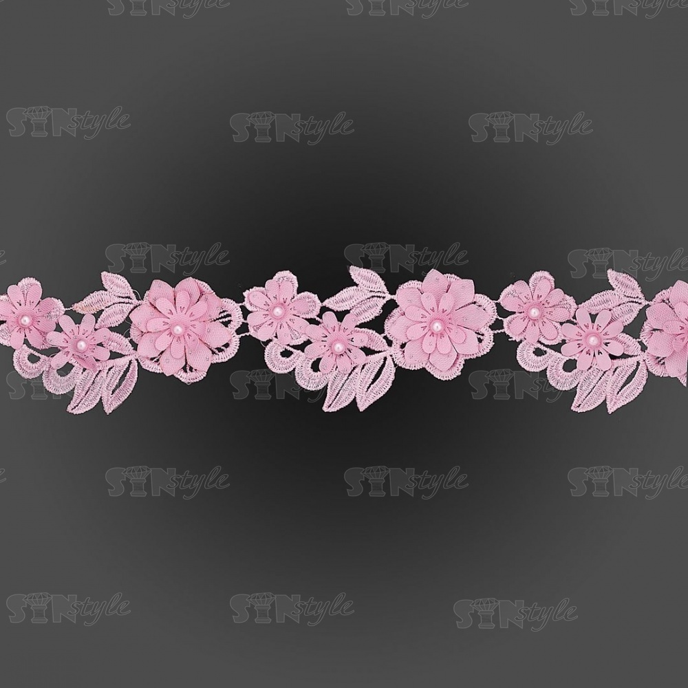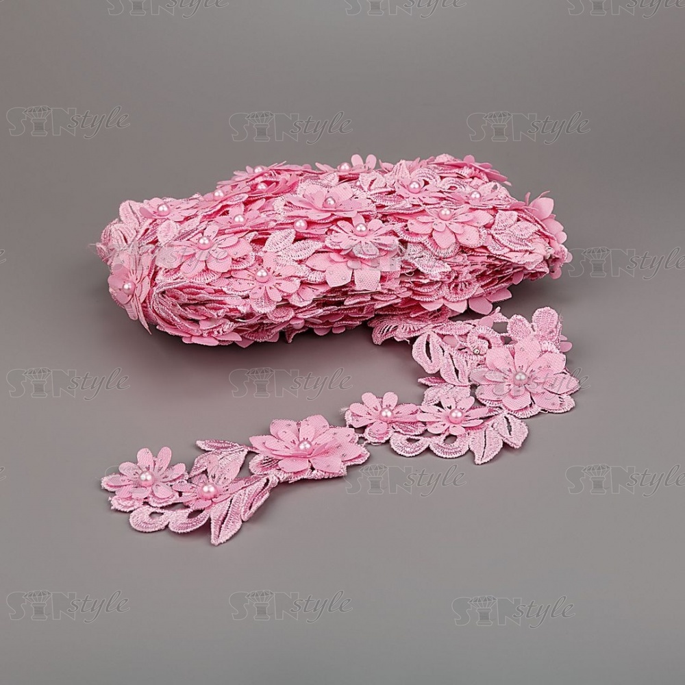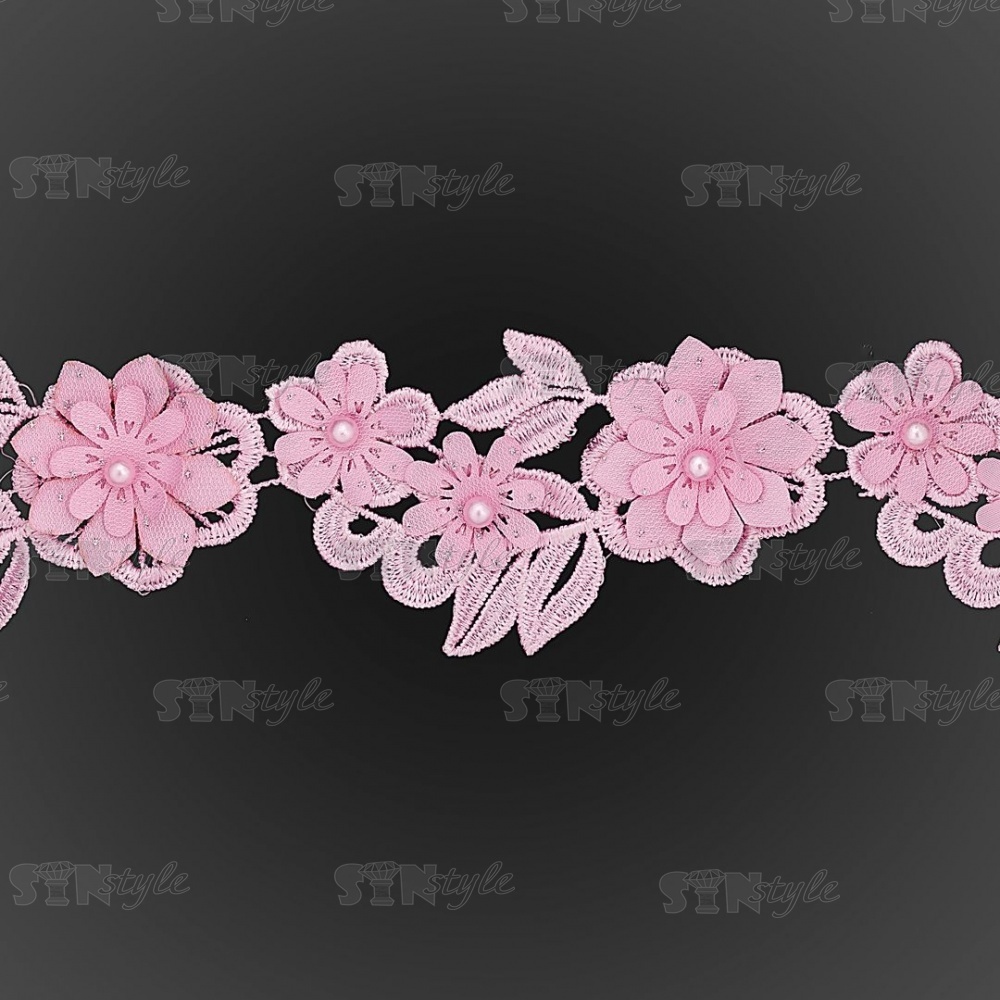 Кружево "Цветочное", ширина 55 мм, цвет розовый, бусины в цвет кружева, намотка 10 ярдов