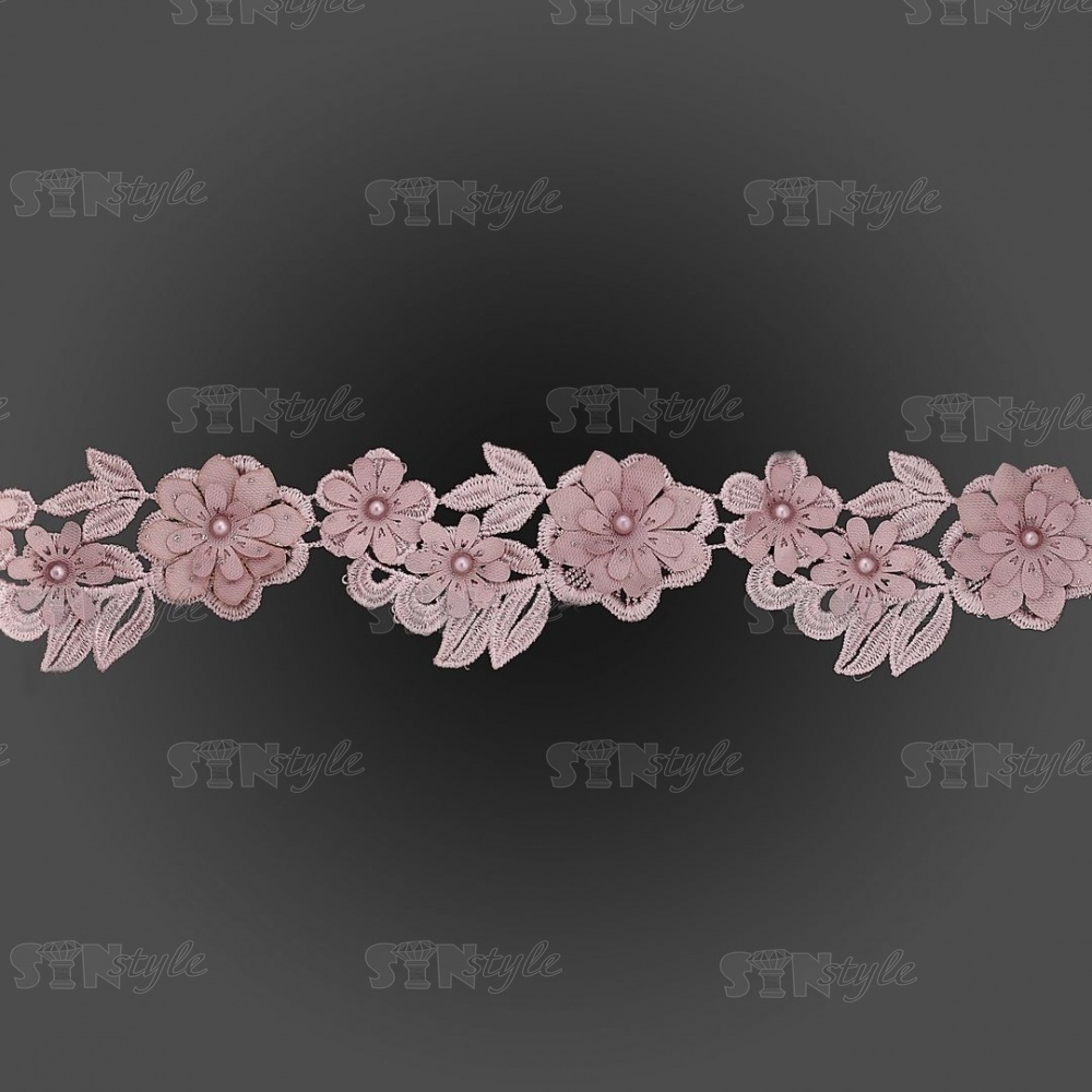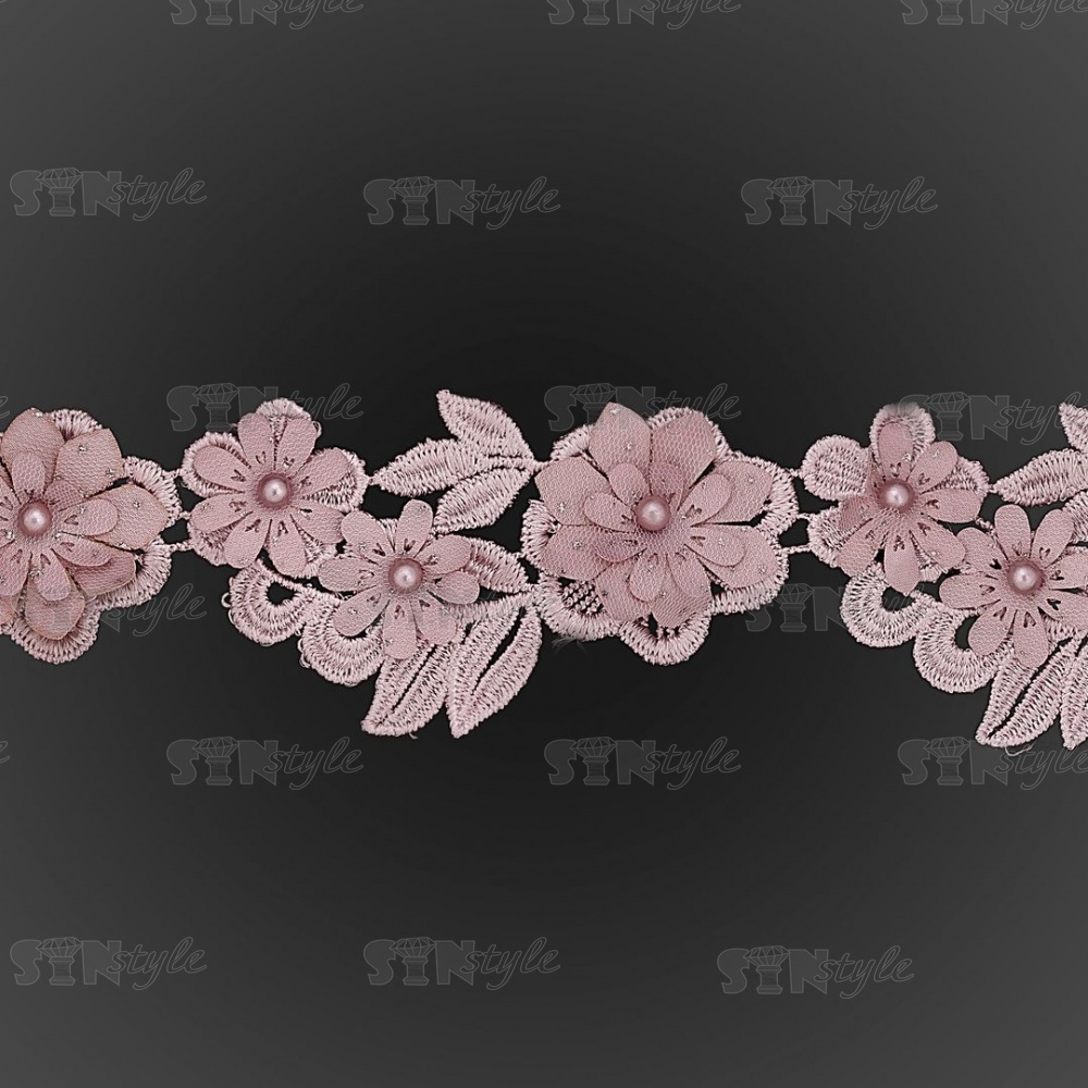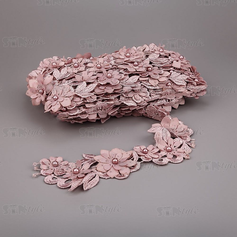 Кружево "Цветочное", ширина 55 мм, цвет грязно-розовый, украшено бусинами в цвет кружева, намотка 10 ярдов