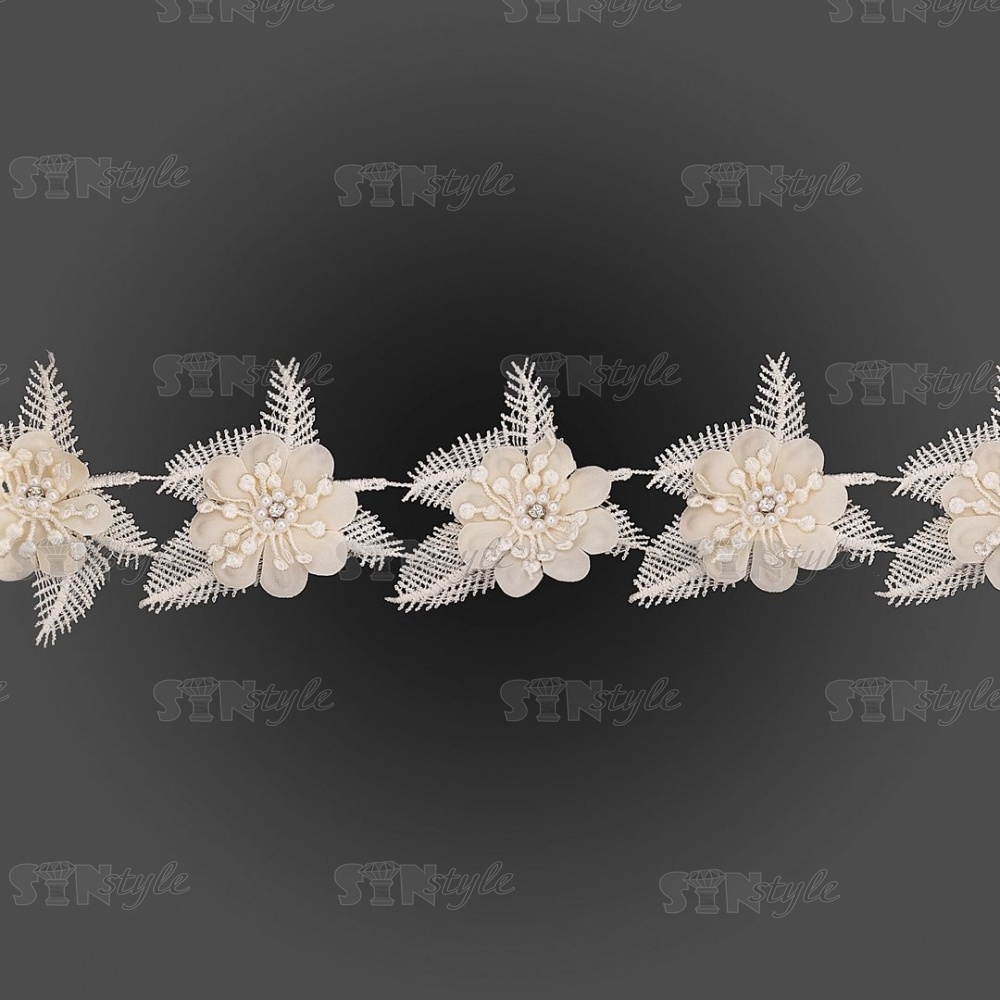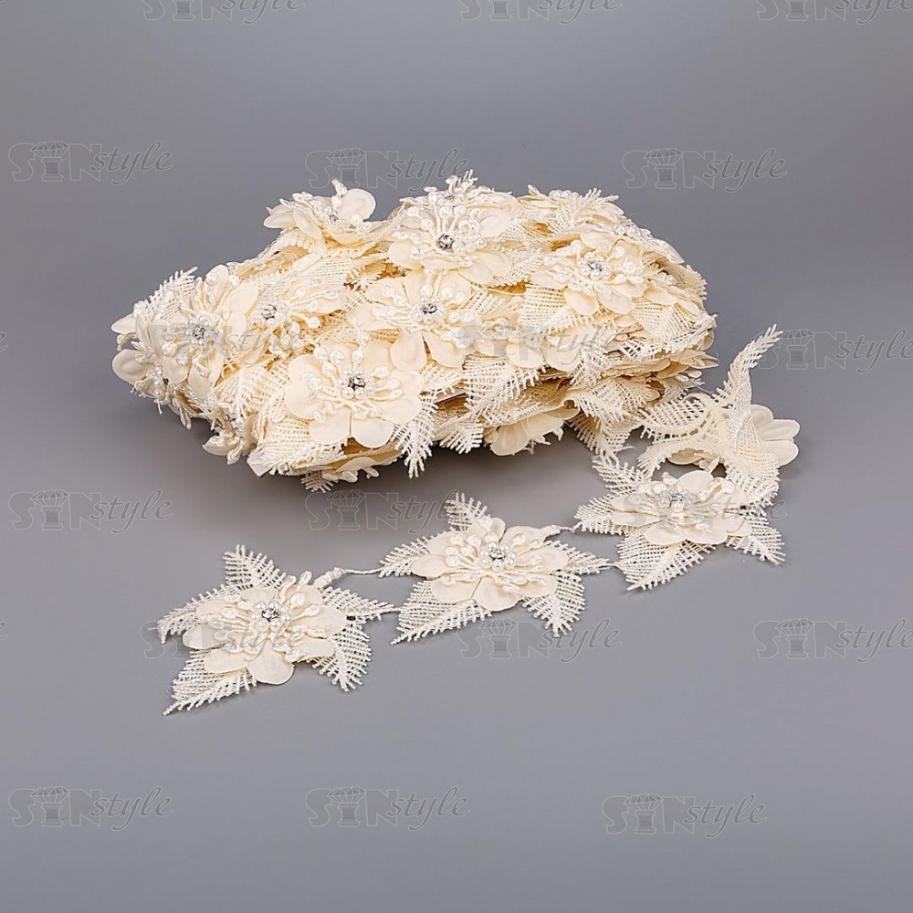 Кружево "Цветочное", воздушная цветочная гирлянда с белой стразой в середине цветка, ширина 80 мм, намотка 10 ярдов, цвет шампань