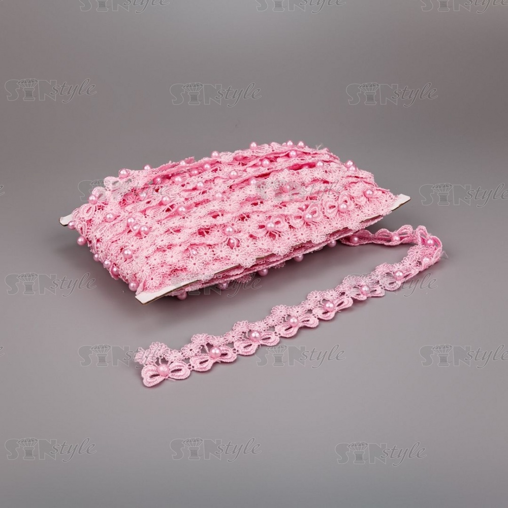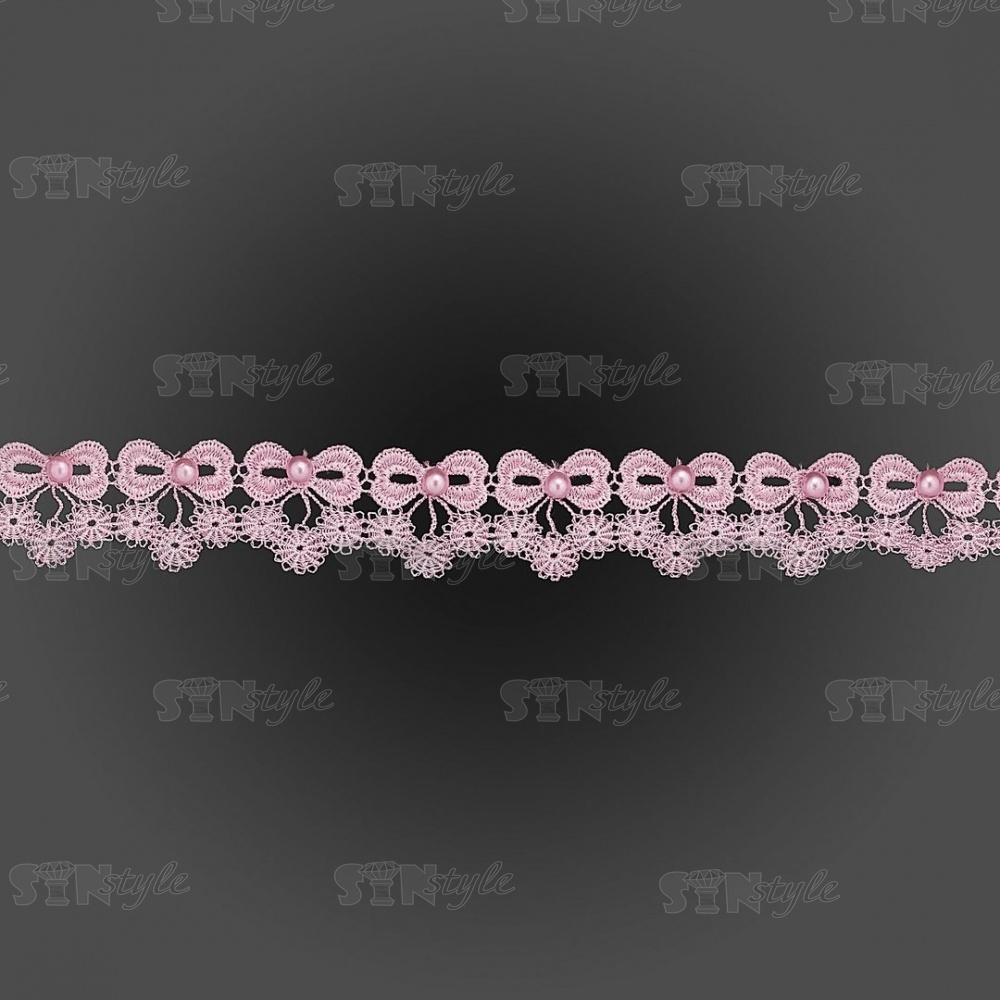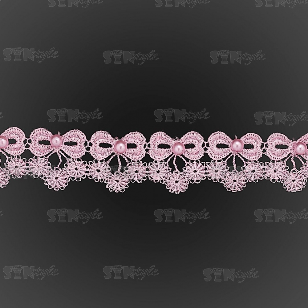 Кружево ажурное в виде бантиков с цветочками и бусинами, ширина 30 мм, намотка 15 ярдов, цвет розовый