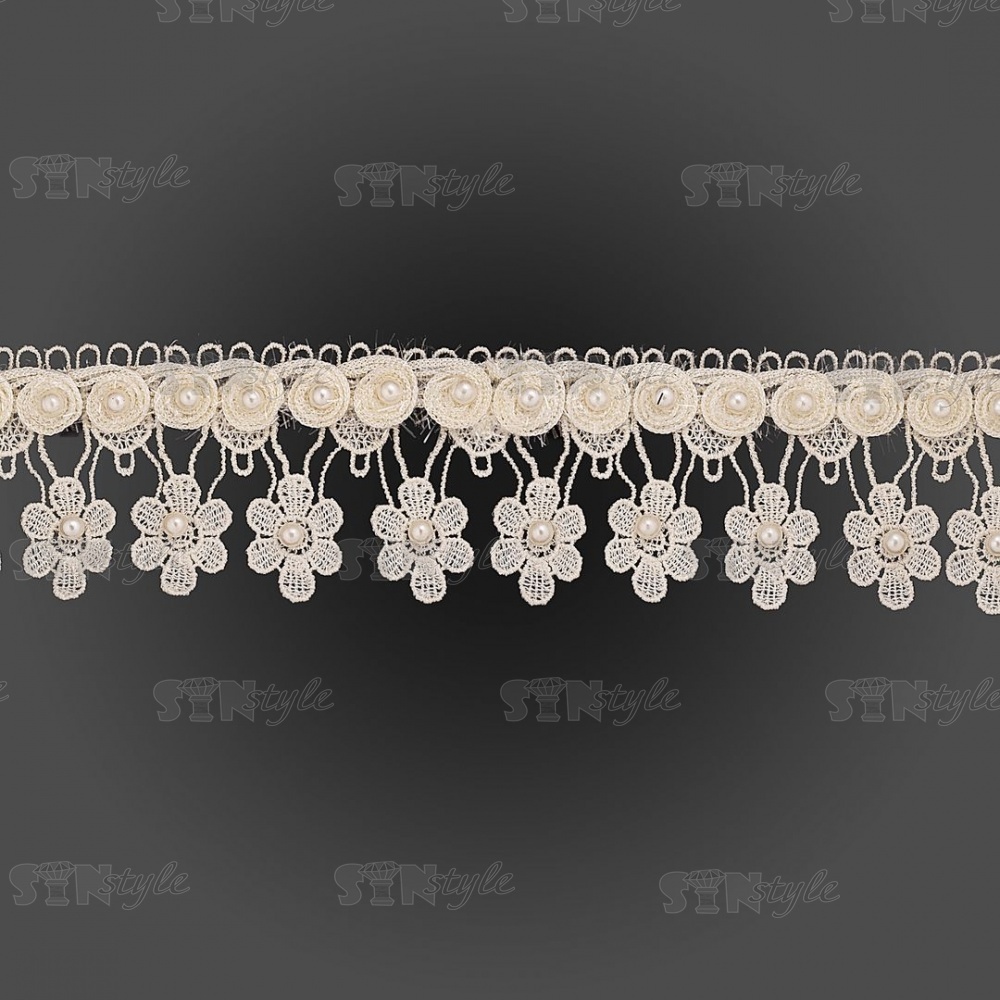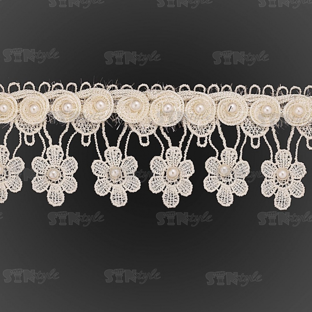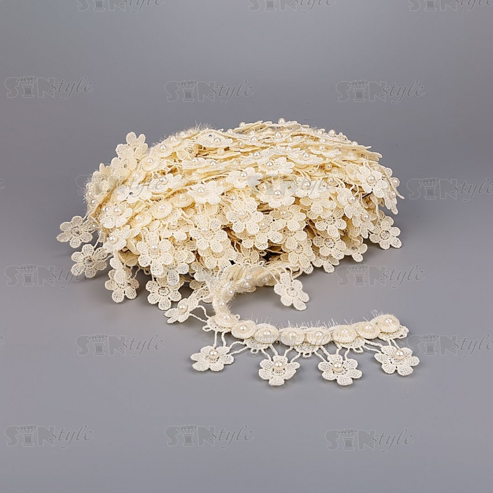 Кружево ажурное с отделкой бусинами, ширина 60 мм, цвет шампань, намотка 10 ярдов