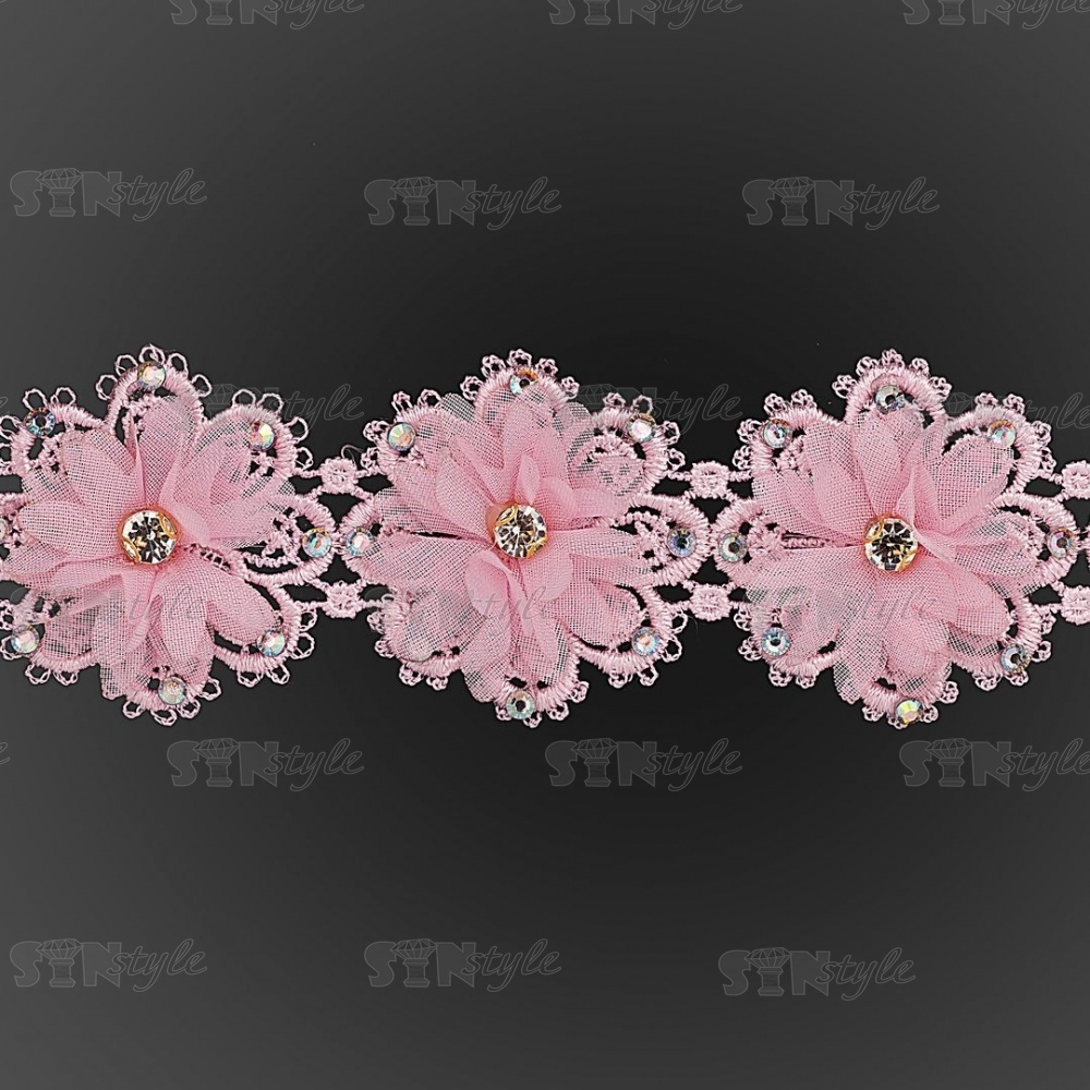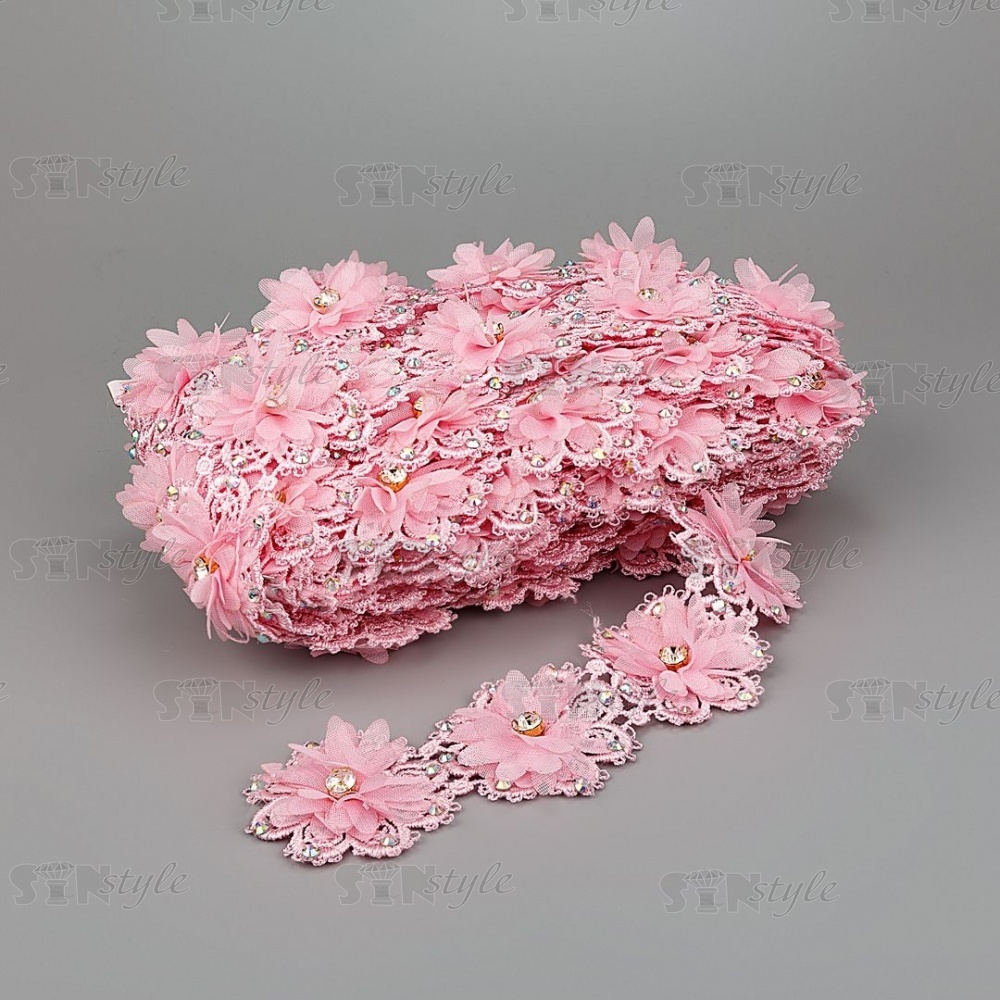 Кружево "Цветочное" ажурное с объемными цветами и стразами, ширина 50 мм, цвет розовый, намотка 10 ярдов