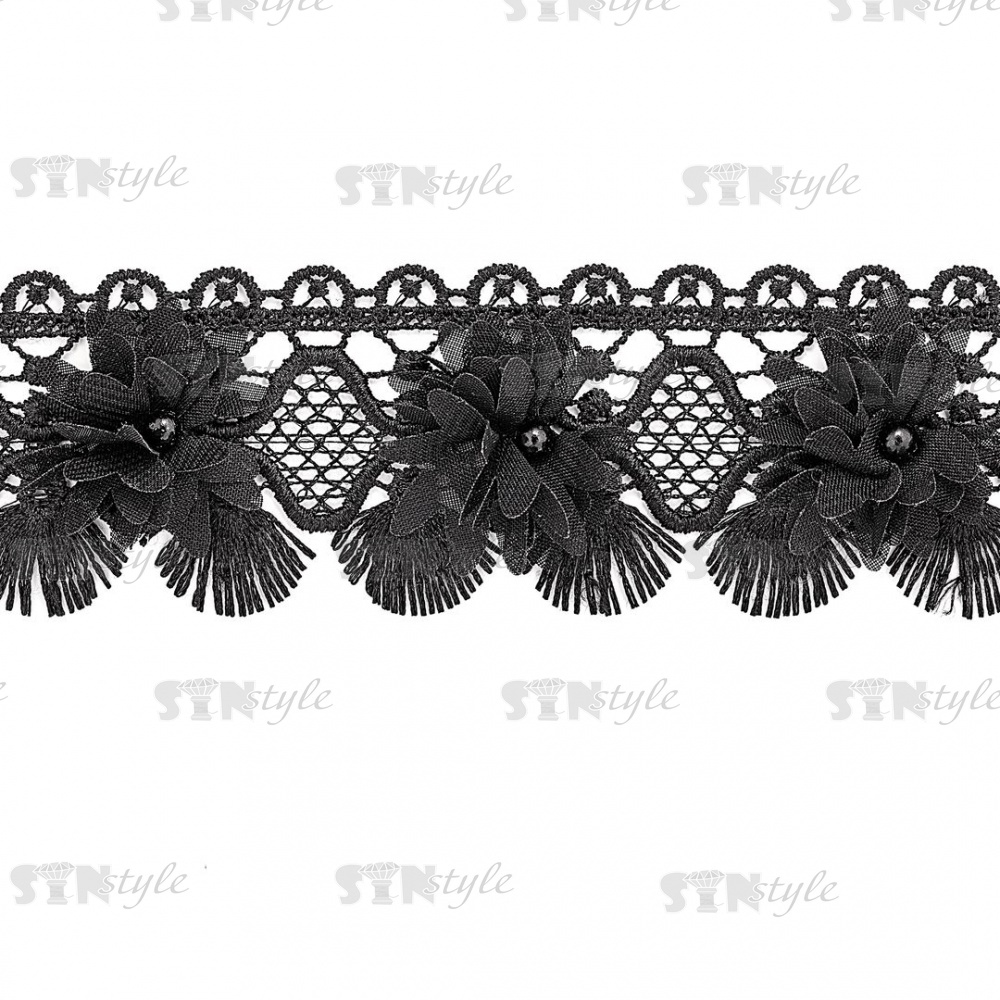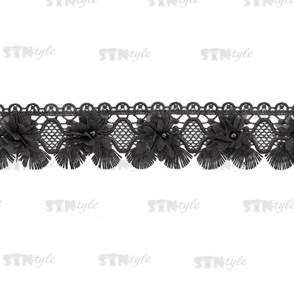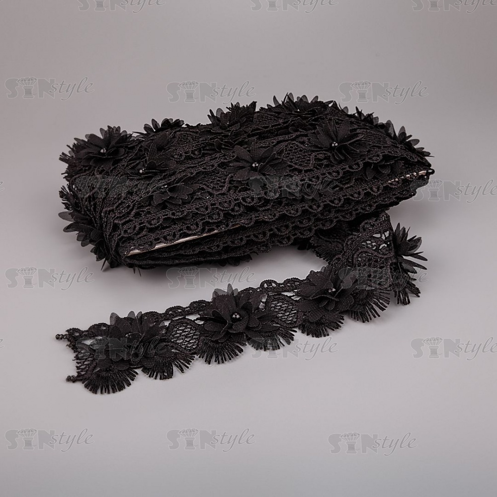 Кружево ажурное с цветочной отделкой и бусинами, ширина 60 мм, цвет черный, намотка 10 ярдов