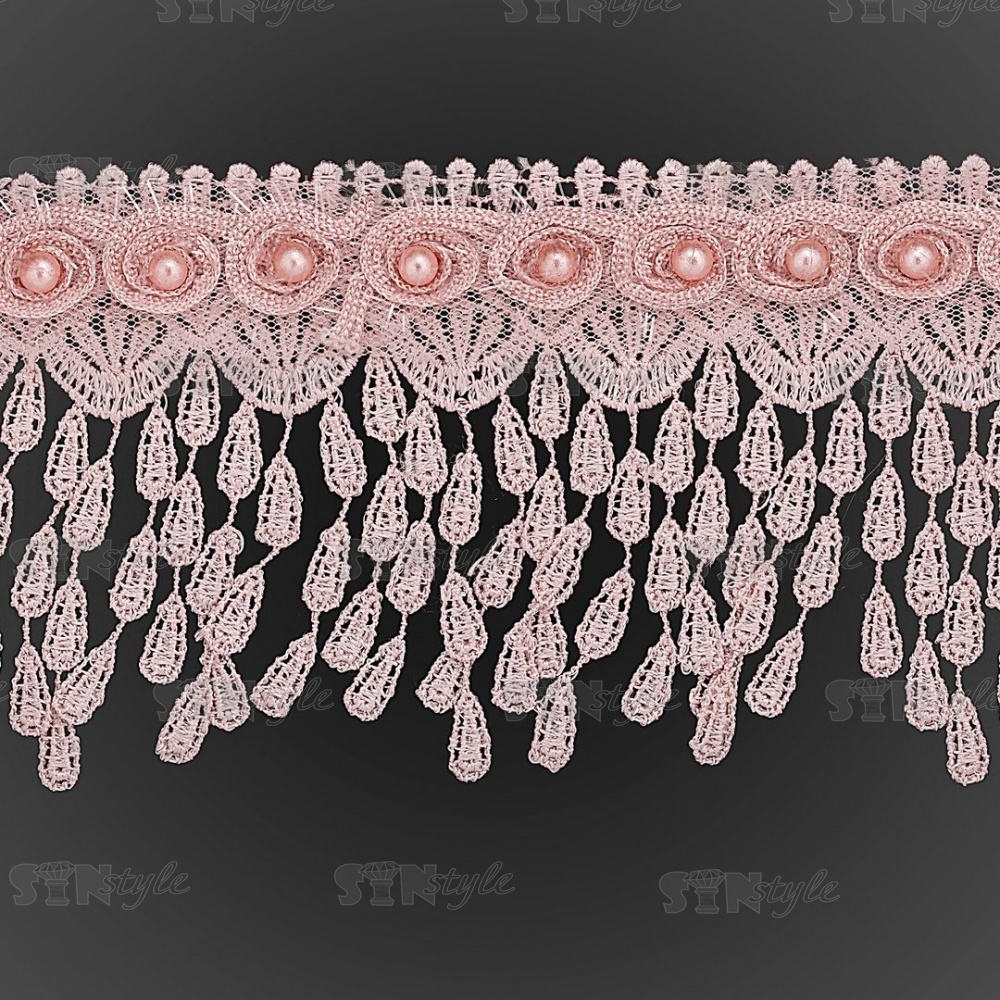 Тонкое ажурное кружево, украшенное бусинами, по нижнему краю нежная бахрома в форме капель, намотка 15 ярдов, ширина 90 мм, цвет грязно-розовый