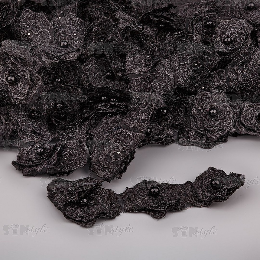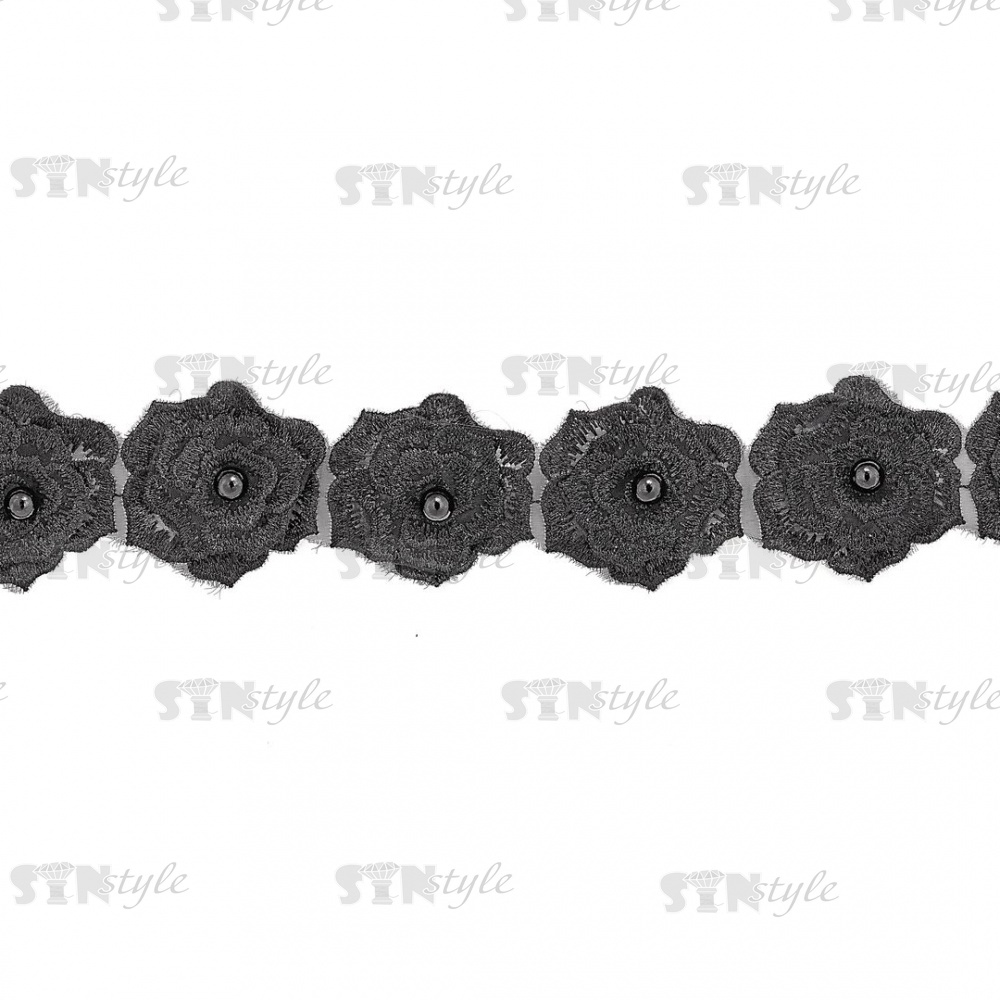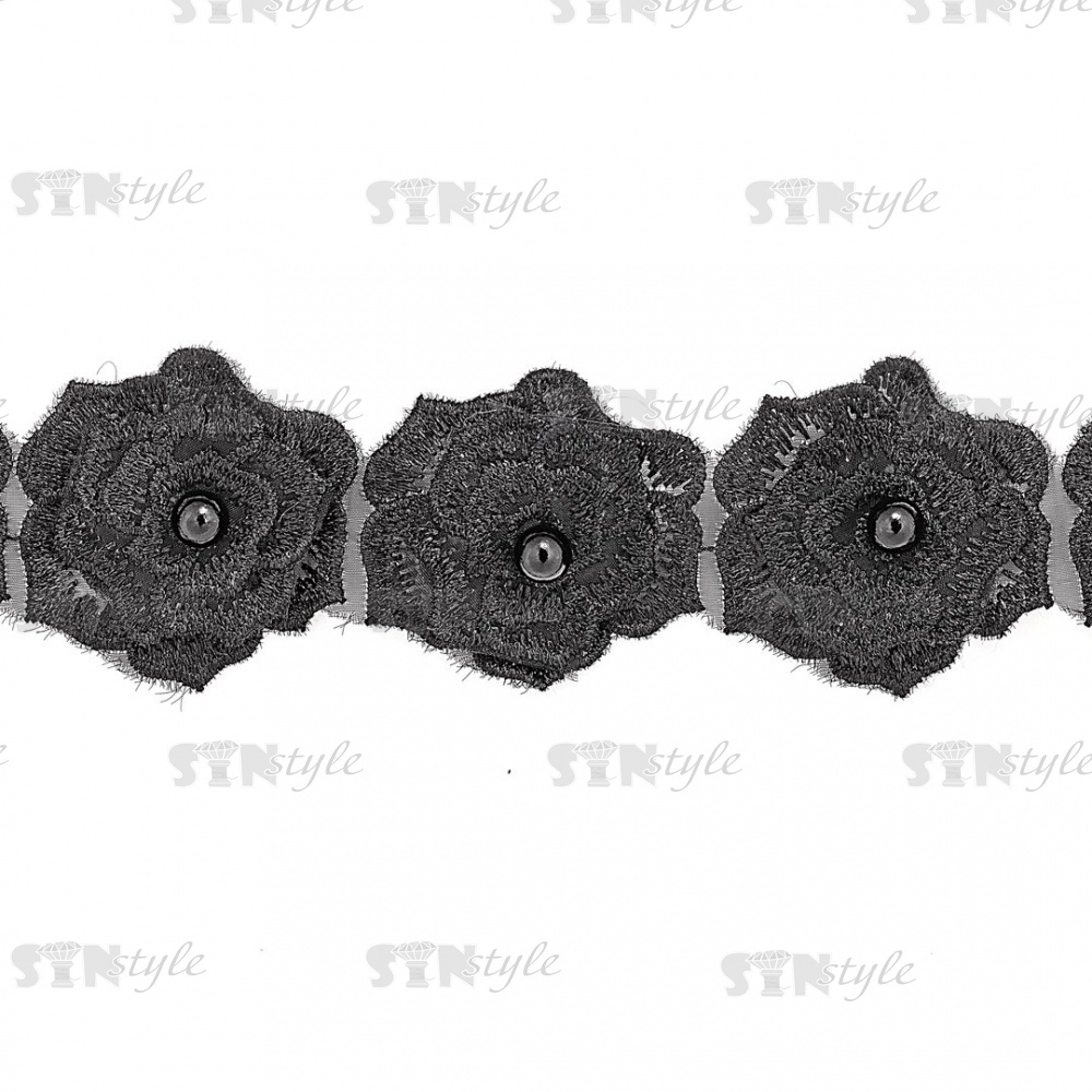Кружево "Цветочки" украшено бусиной, на капроновой ленте, ширина 55 мм, цвет черный (6), намотка 20 ярдов