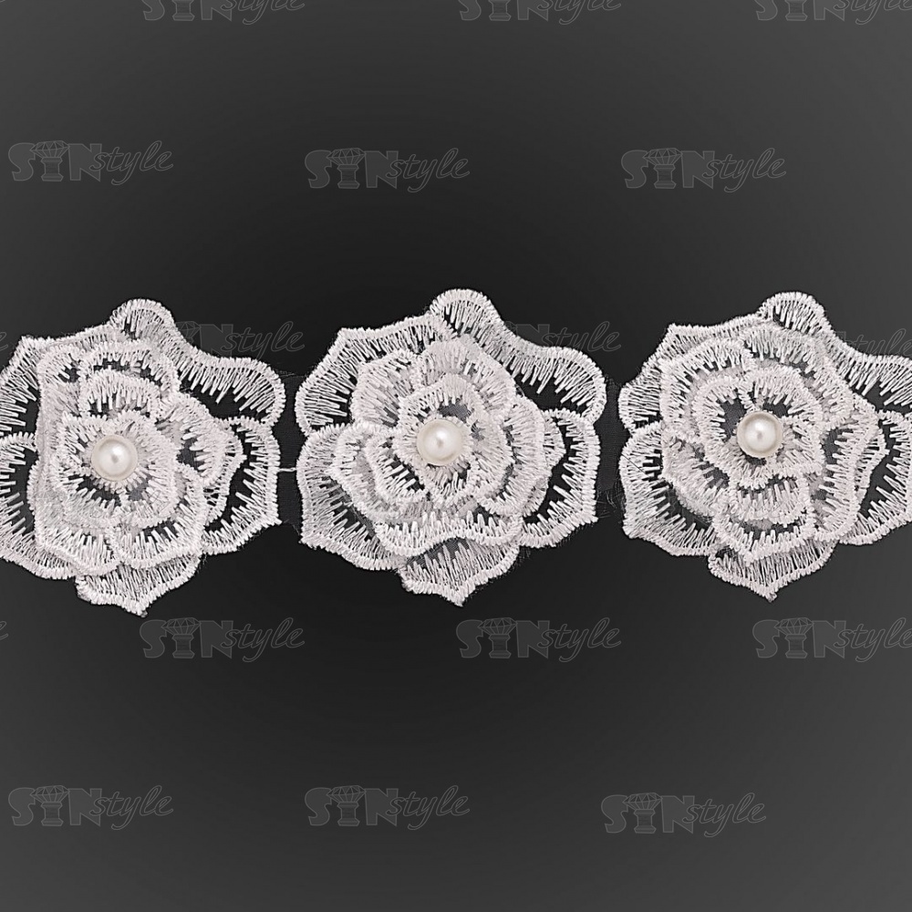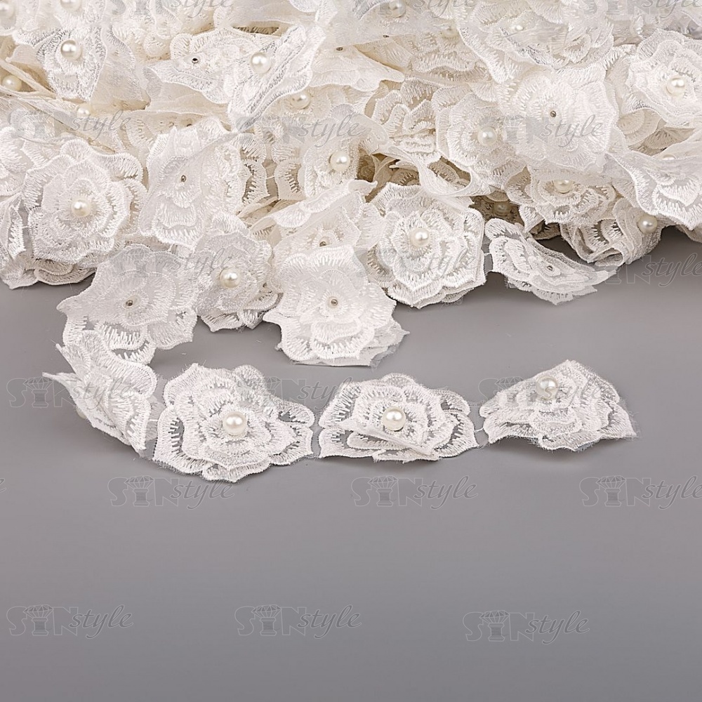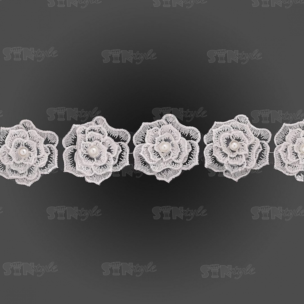 Кружево "Цветочки" украшено бусиной, на капроновой ленте, ширина 55 мм, цвет белый (7), намотка 20 ярдов