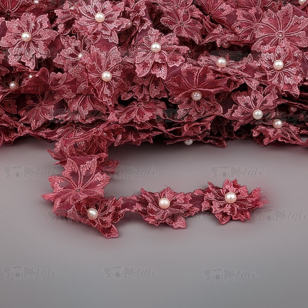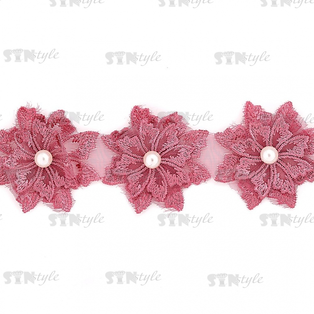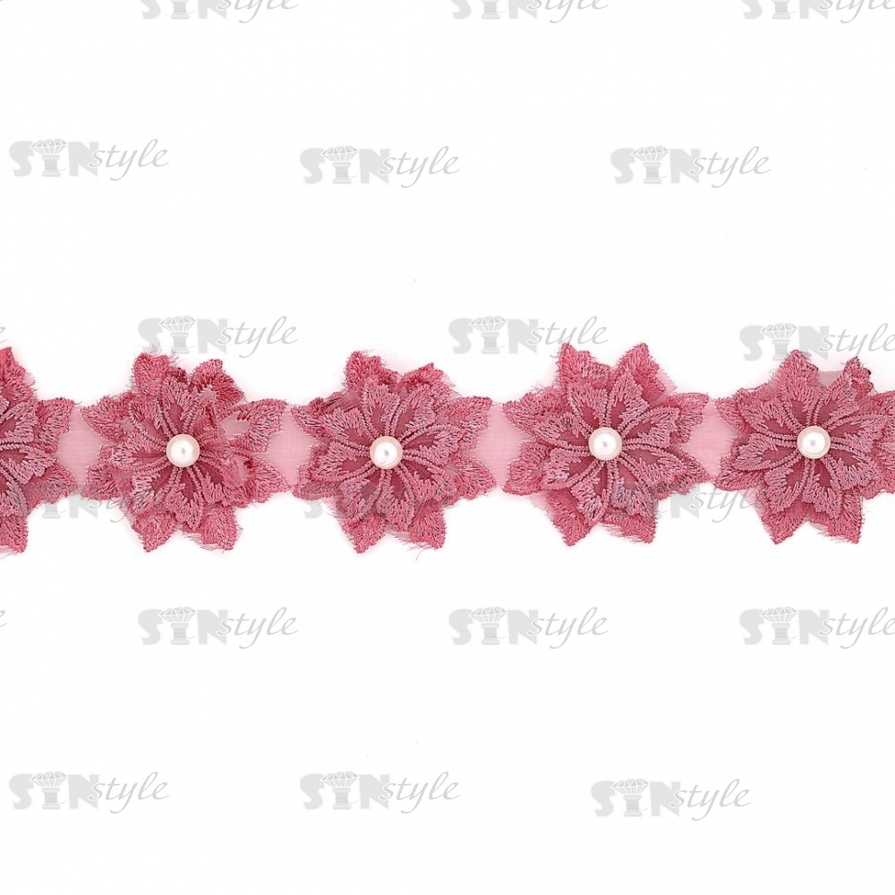 Кружево "Цветочки" украшено бусиной , на капроновой ленте, ширина 55 мм, цвет старо-розовый, намотка 20 ярдов