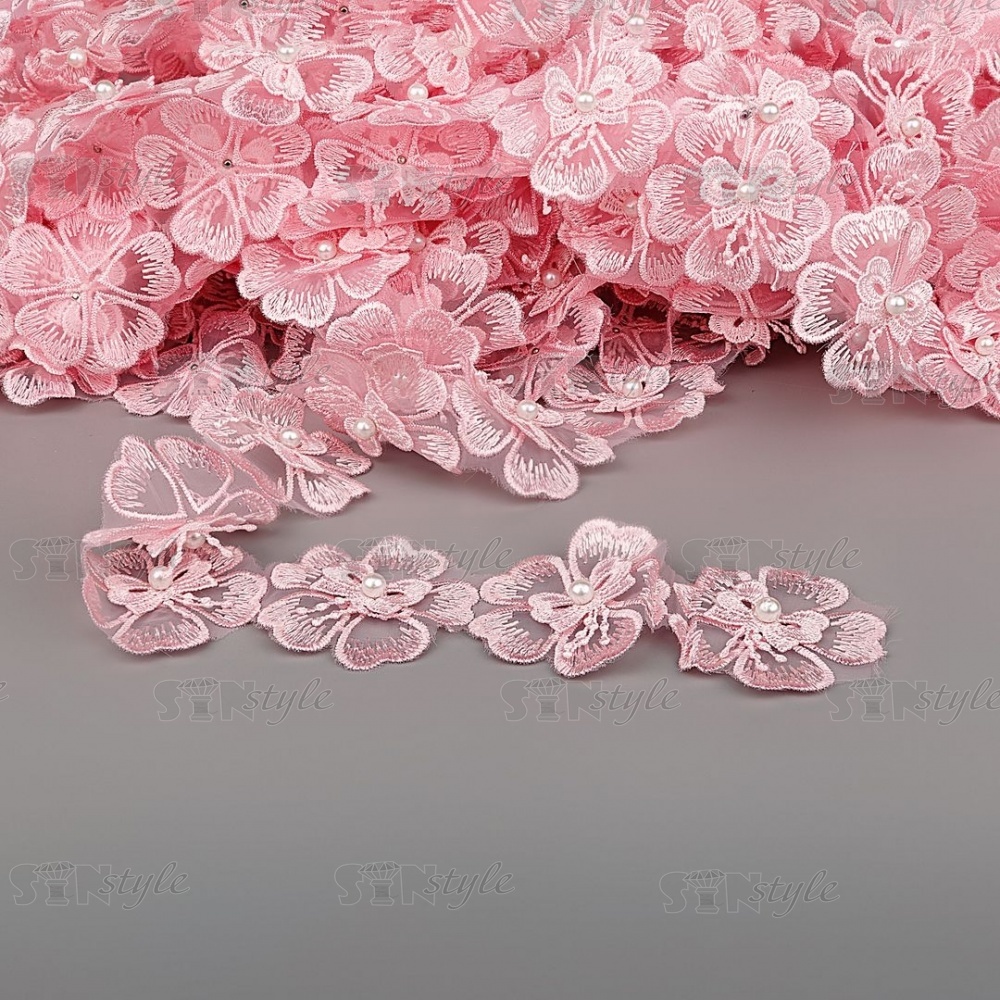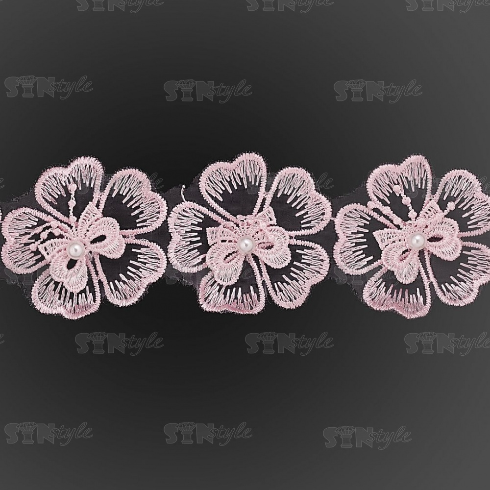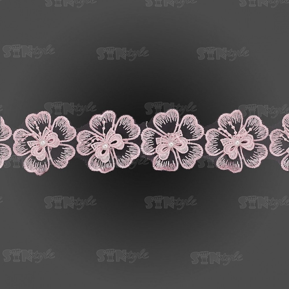 Кружево "Цветочки" украшено бусиной белого цвета, на капроновой ленте, ширина 55 мм, цвет розовый, намотка 20 ярдов