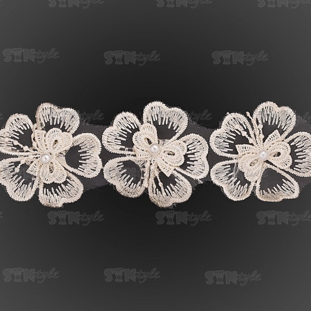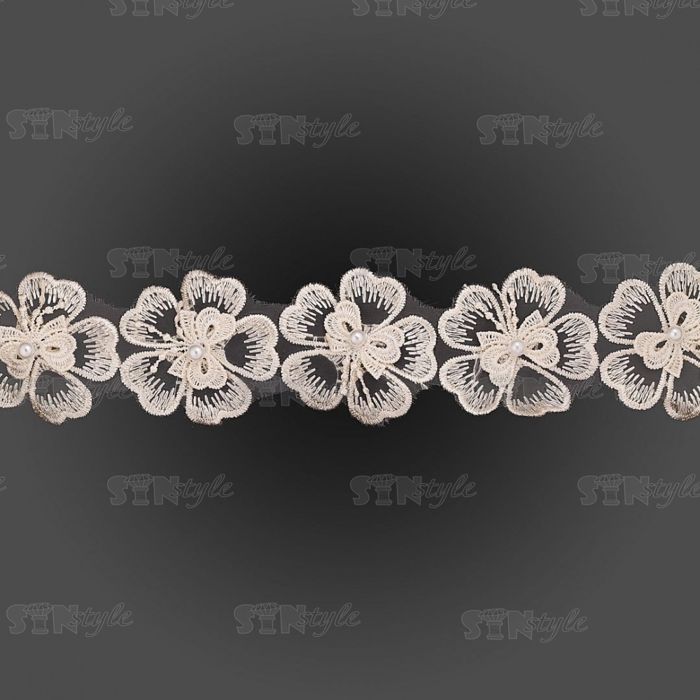 Кружево "Цветочки", нежная объемная цветочная гирлянда с бусиной в центре каждого цветка, на капроновой ленте, ширина 55 мм, цвет шампань, намотка 20 ярдов