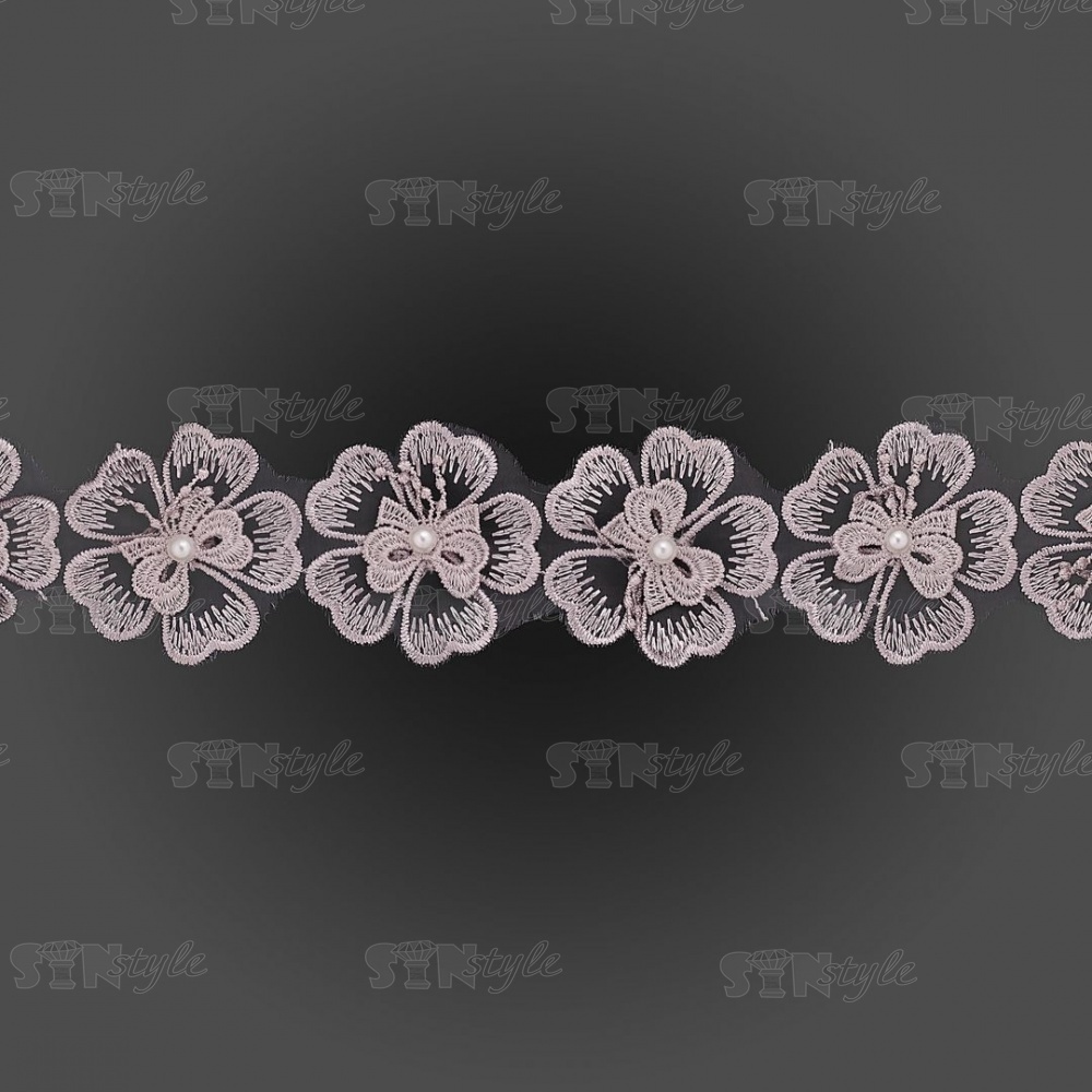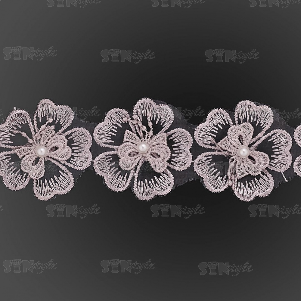 Кружево "Цветочки", объемная нежная цветочная гирлянда с бусиной белого цвета, на капроновой ленте, ширина 55 мм, цвет серый, намотка 20 ярдов