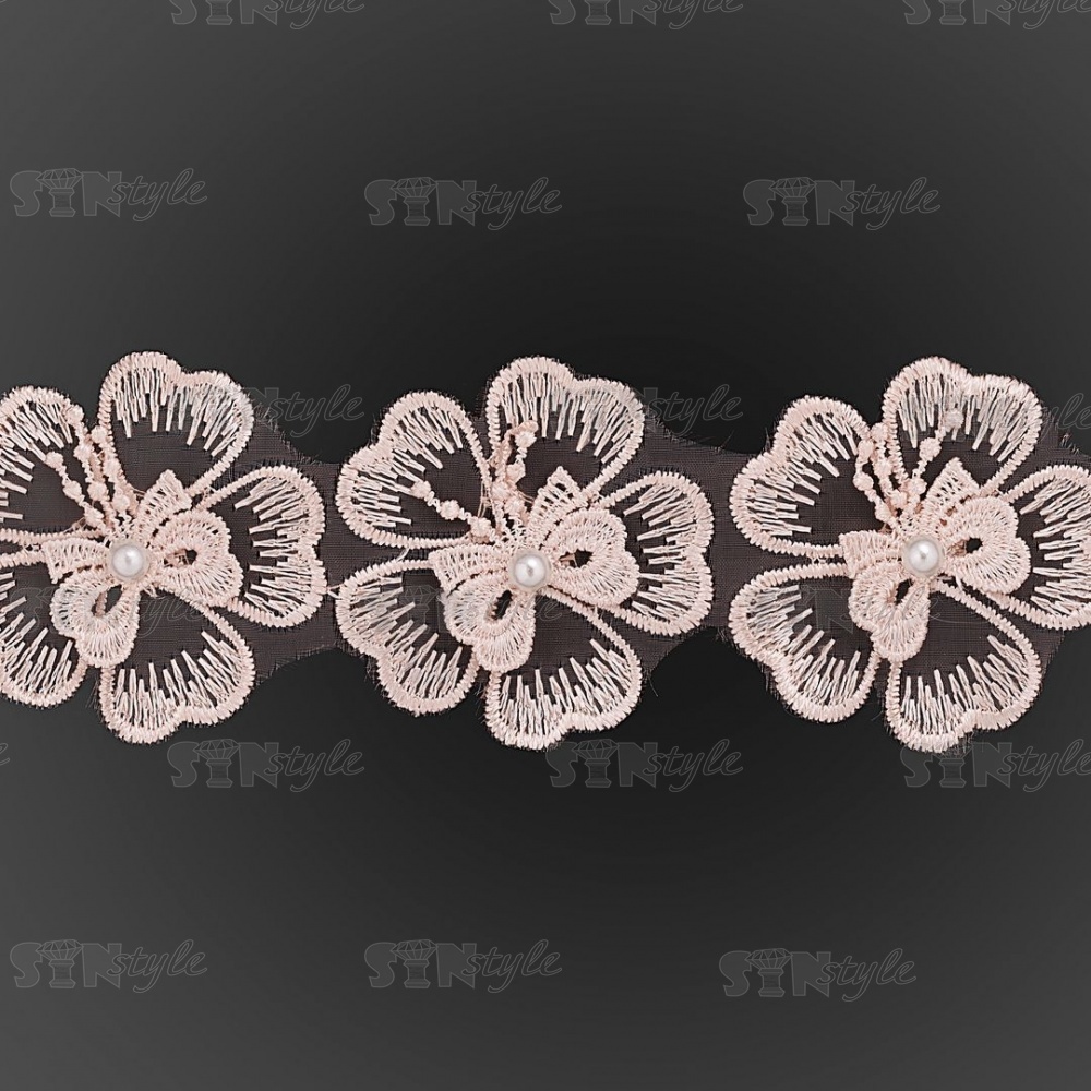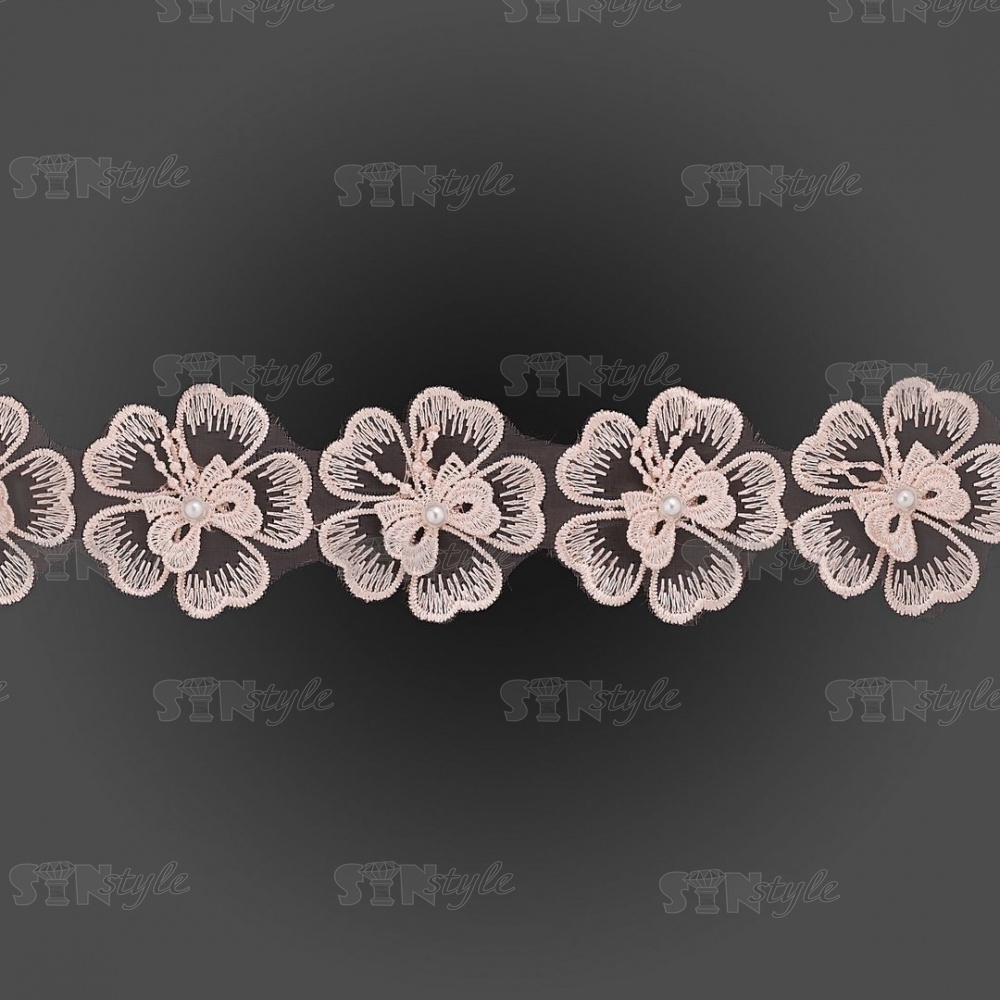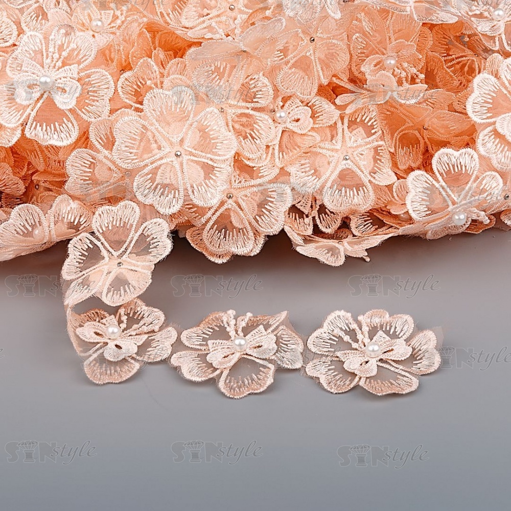 Кружево "Цветочки", нежная объемная цветочная гирлянда с бусиной белого цвета, на капроновой ленте, ширина 55 мм, цвет персиковый, намотка 20 ярдов
