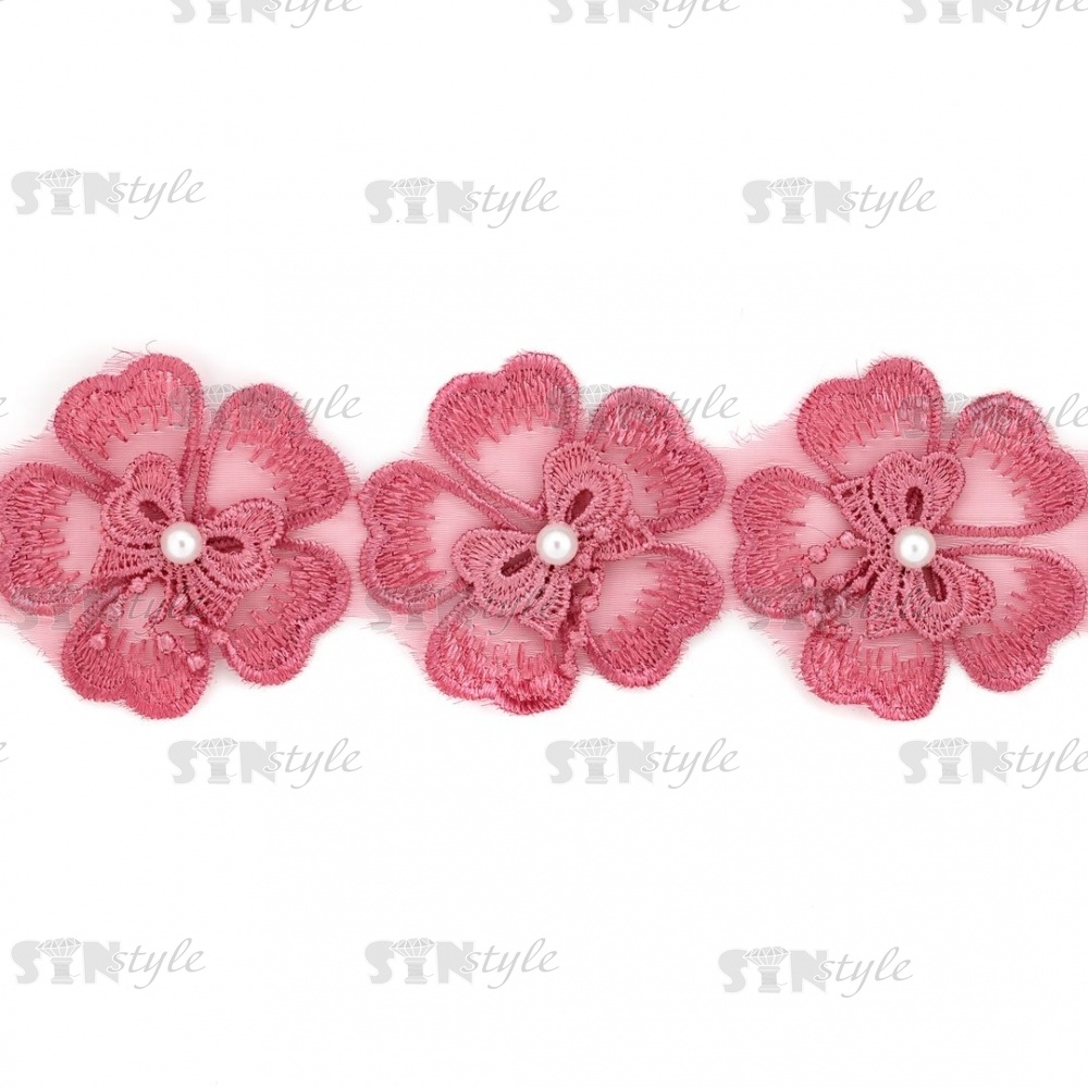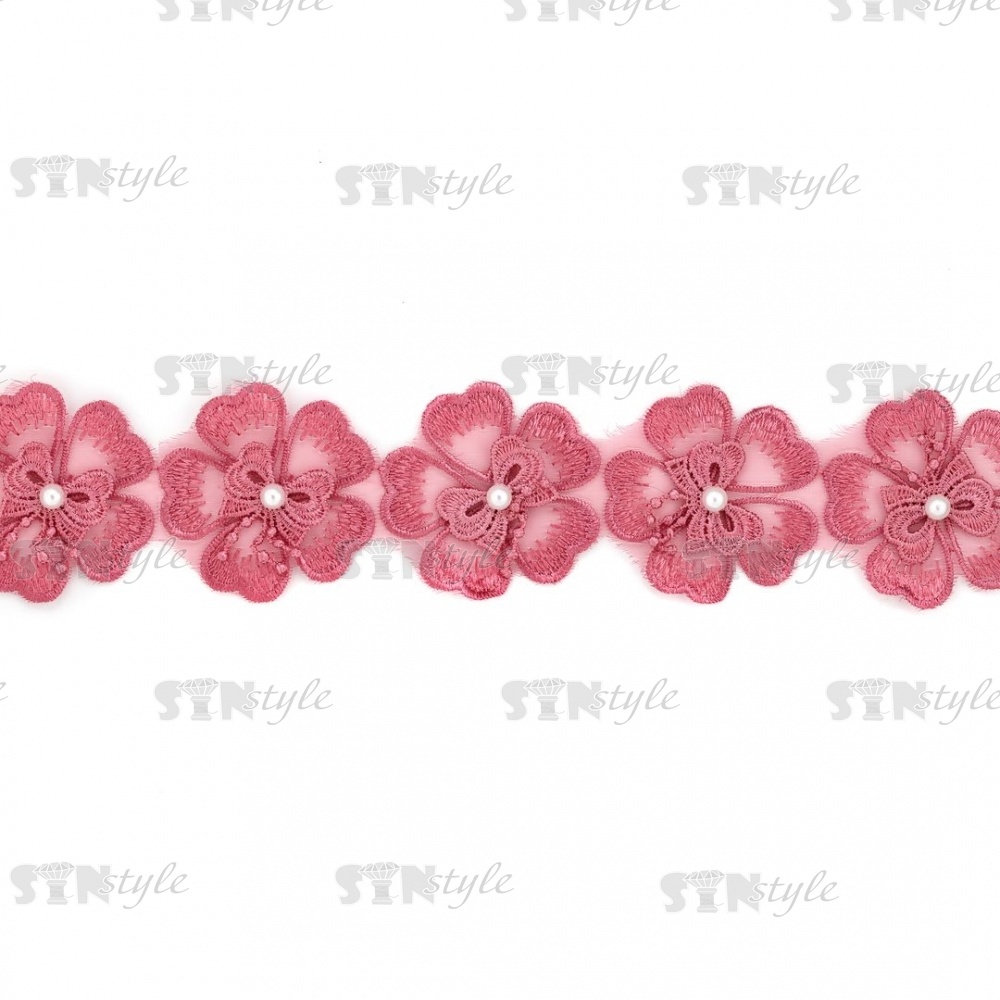 Кружево "Цветочки", нежная объемная цветочная гирлянда с бусиной белого цвета, на капроновой ленте, ширина 55 мм, цвет старо-розовый, намотка 20 ярдов