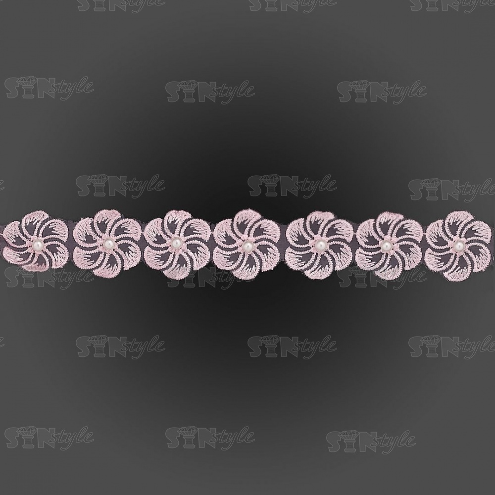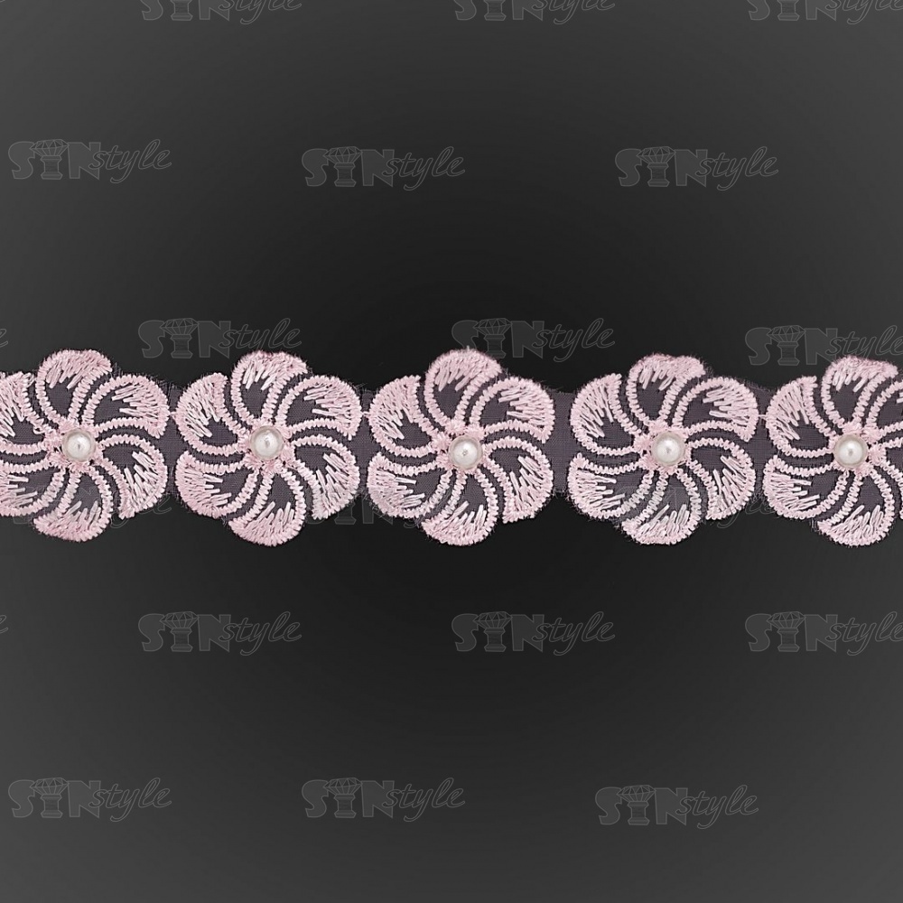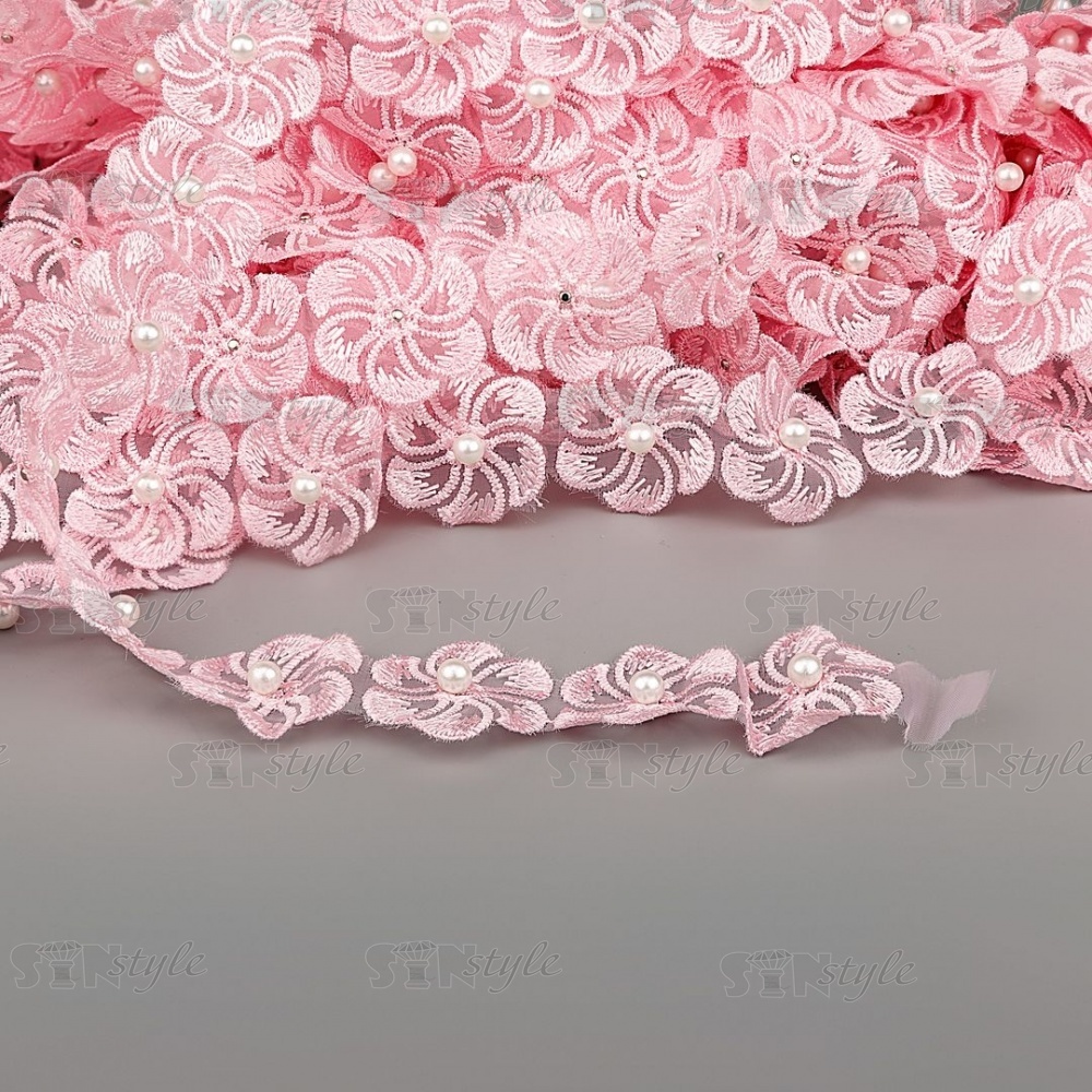 Кружево "Цветочки" на капроновой ленте, ширина 35 мм, цвет розовый+белые бусины, намотка 20 ярдов