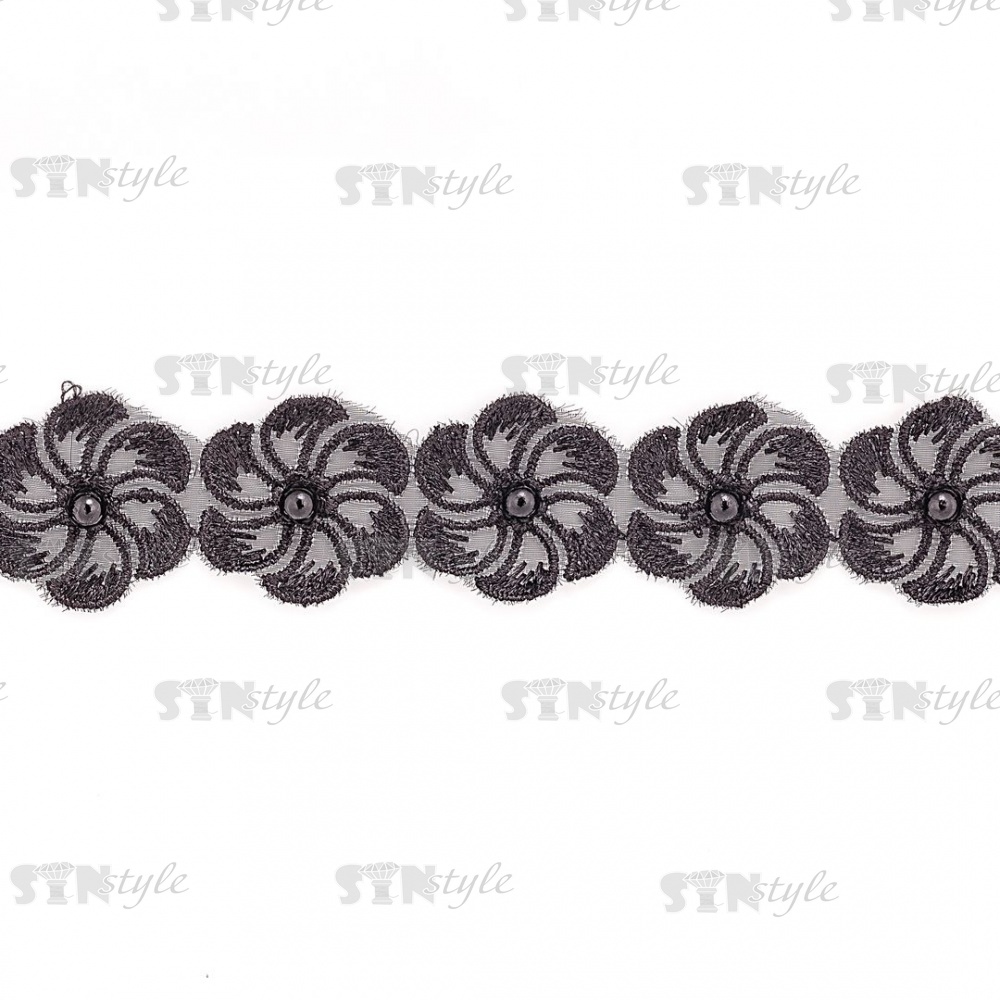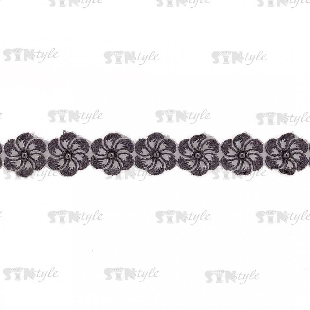 Кружево "Цветочки" на капроновой ленте, ширина 35 мм, цвет черный+белые бусины, намотка 20 ярдов