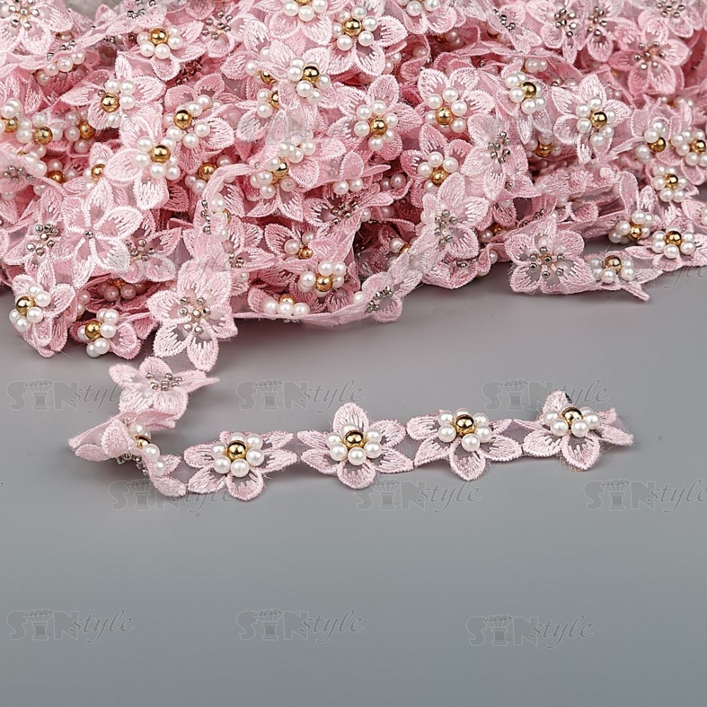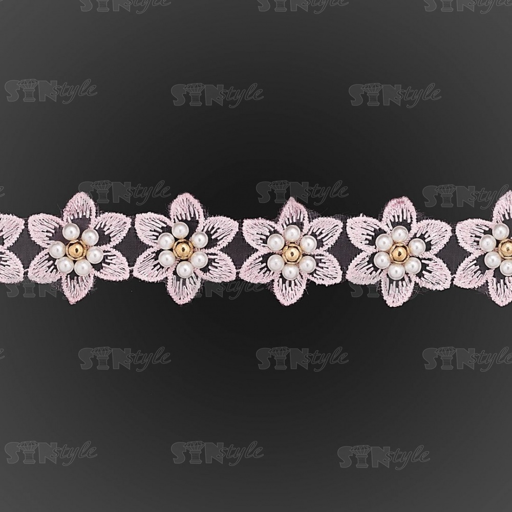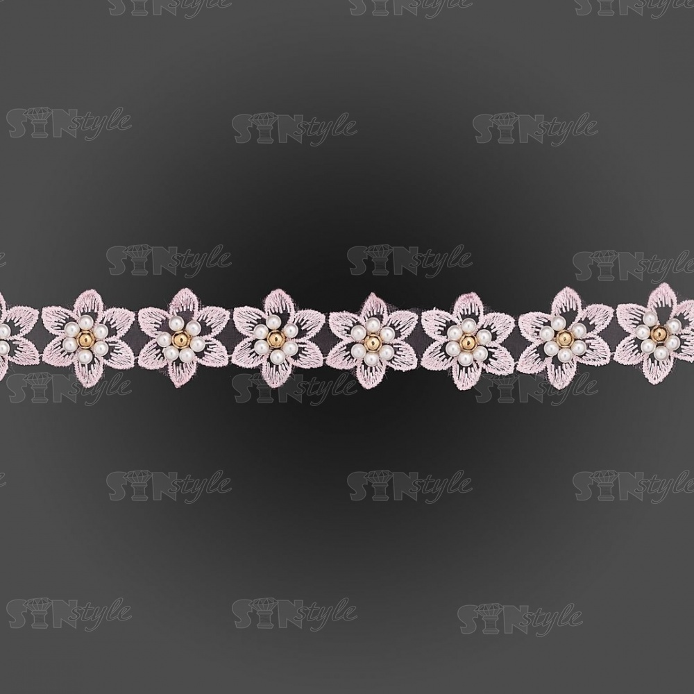 Кружево "Цветочки" украшено бусинами ,на капроновой ленте, ширина 30 мм, цвет розовый, намотка 20 ярдов, #21