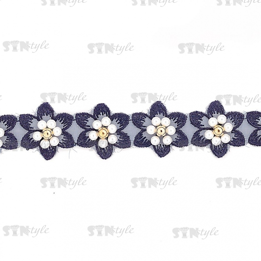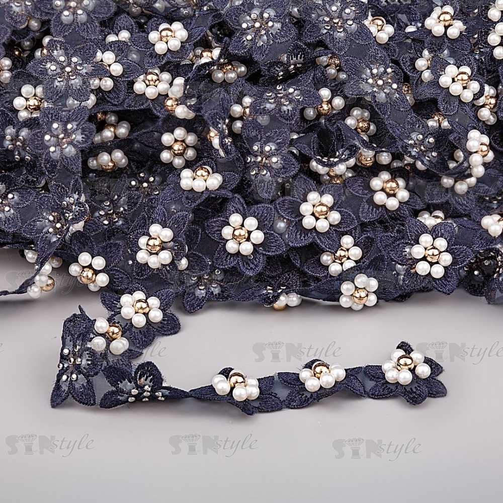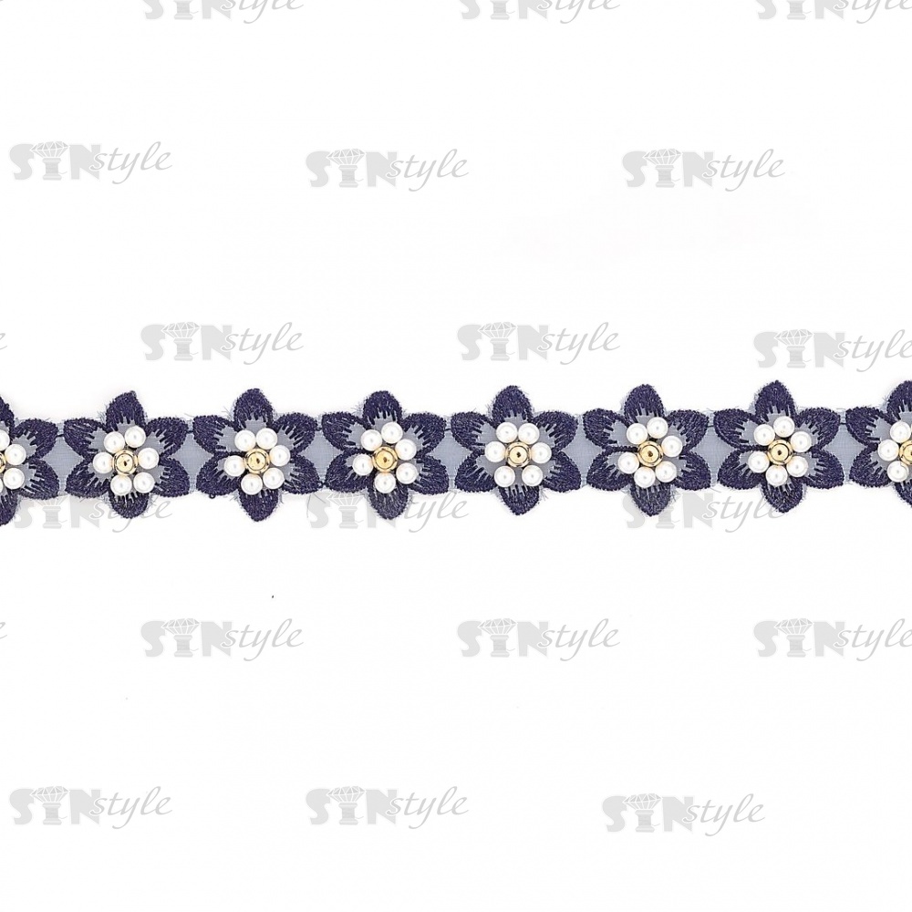 Кружево "Цветочки" украшено бусинами контрастного цвета,на капроновой ленте, ширина 30 мм, цвет темно-синий, намотка 20 ярдов