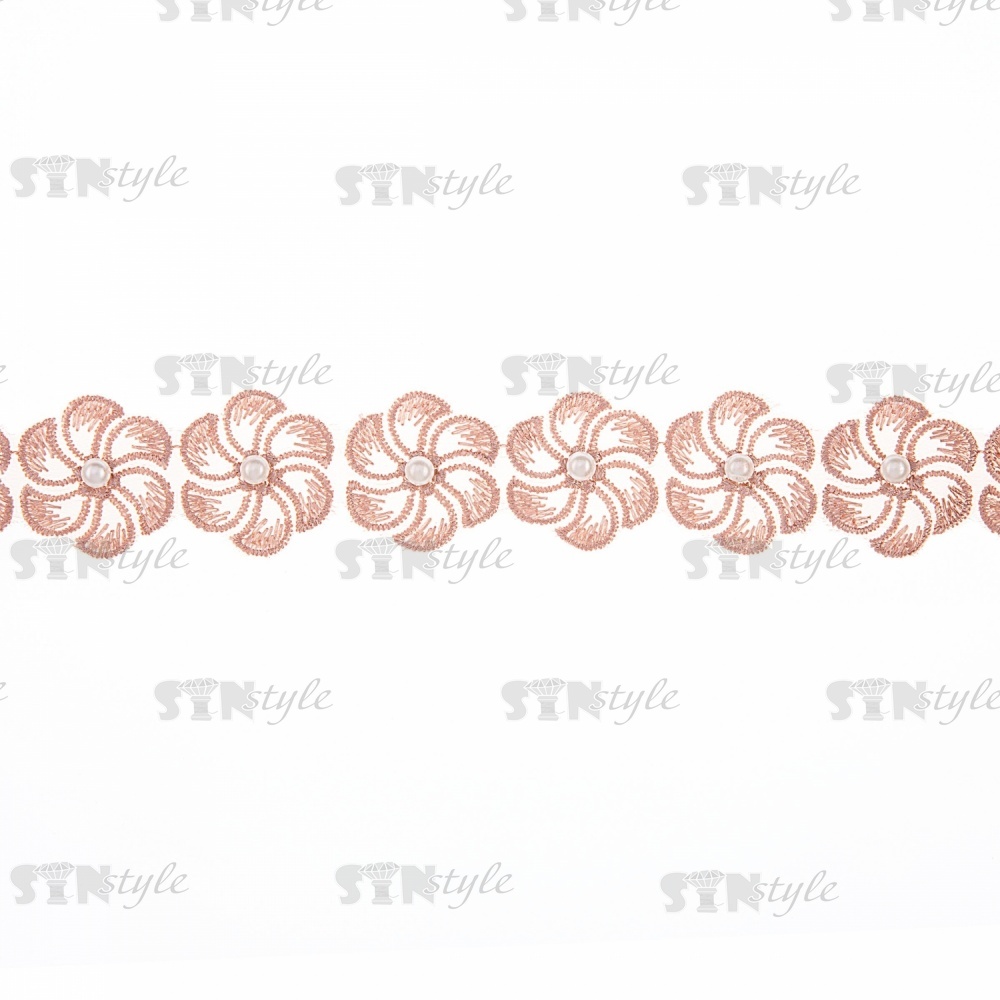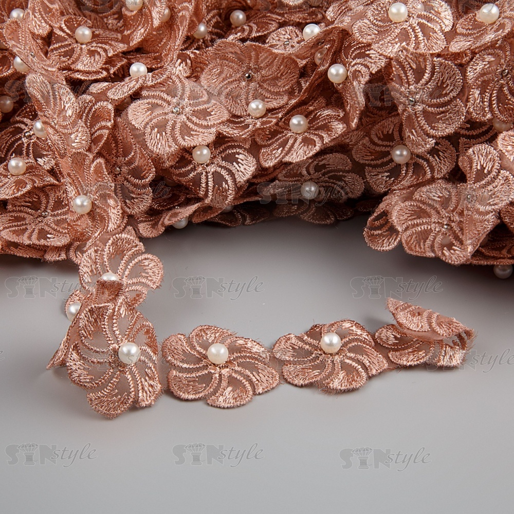 Кружево "Цветочки" на капроновой ленте, ширина 35 мм, цвет капучино+белые бусины, намотка 20 ярдов