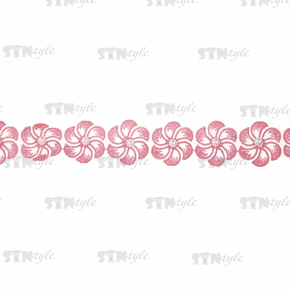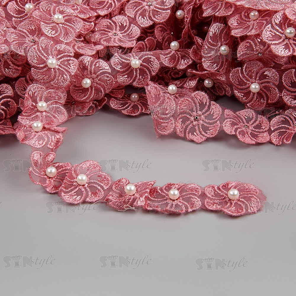 Кружево "Цветочки" на капроновой ленте, ширина 35 мм, цвет грязно-розовый+белые бусины, намотка 20 ярдов
