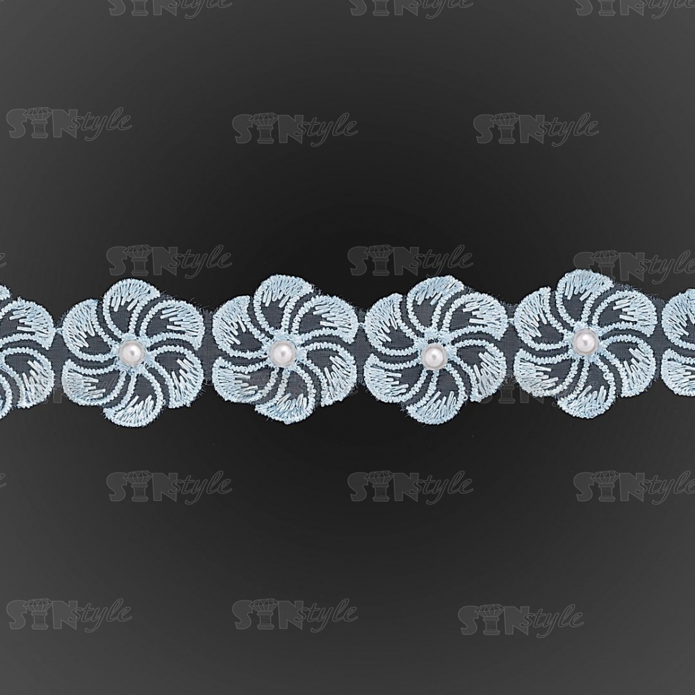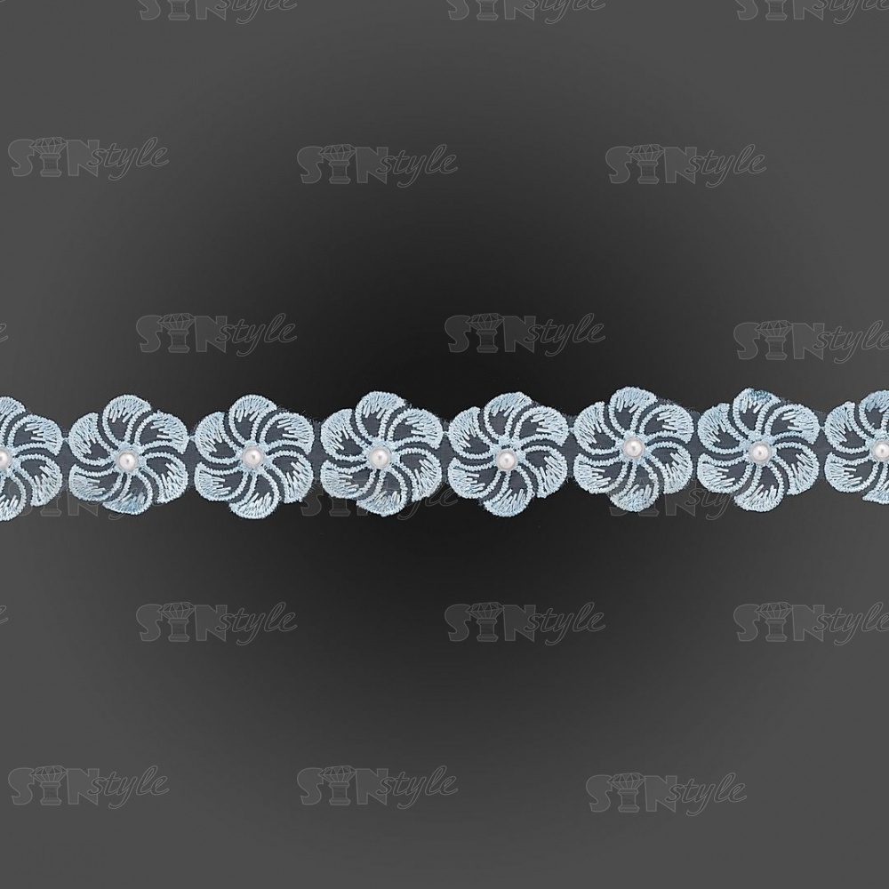 Кружево "Цветочки" на капроновой ленте, ширина 35 мм, цвет голубой+белые бусины, намотка 20 ярдов