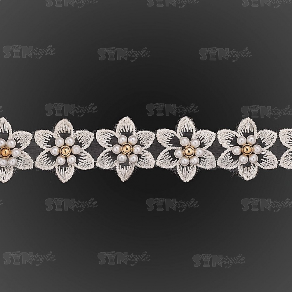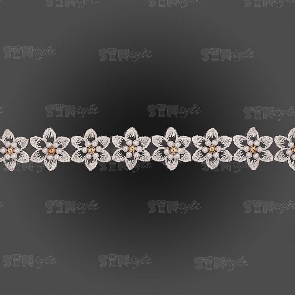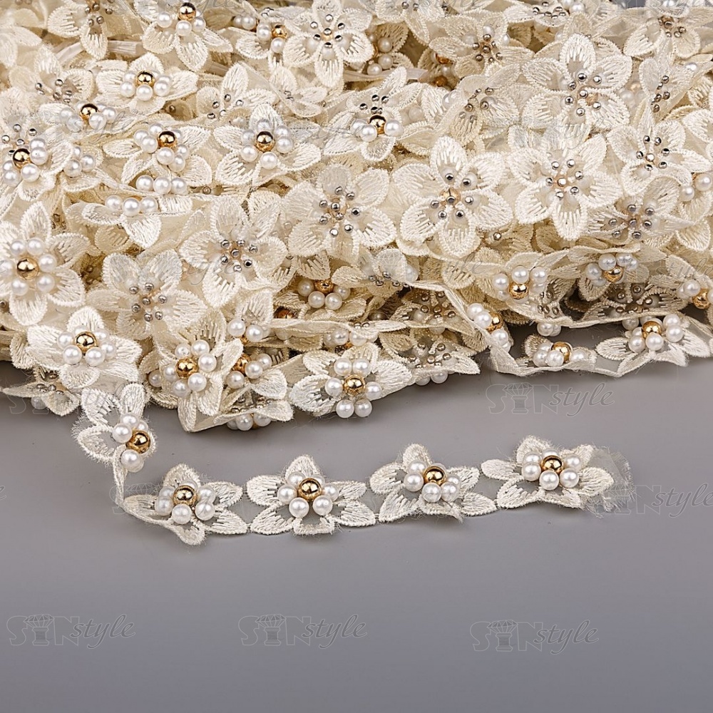 Кружево "Цветочки" украшено бусинами, на капроновой ленте, ширина 30 мм, цвет шампань, намотка 20 ярдов, #21