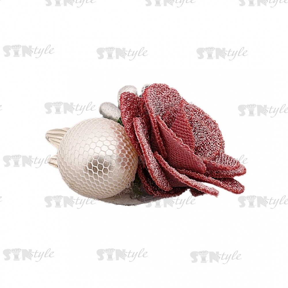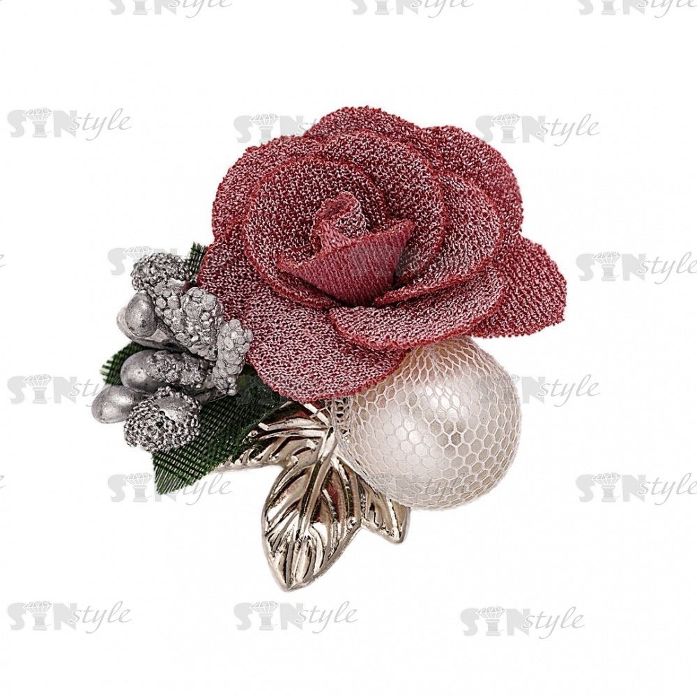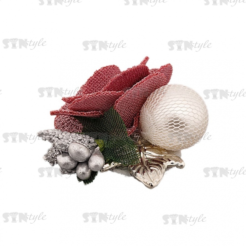 Композиция на фетровой основе из тканевого цветка, крупной бусины, обтянутой сеткой, тычинок с напылениеми и листочков. Такое украшение имеет широкий диапазон применения: как отделочный элемент для платья, блузки, театрального костюма, шапочки, косынки, берета, повязки, ободка для волос, резинок, заколок, а так же обуви из текстиля. Также можно использовать в украшении букетов, подарочной упаковки, праздничных композиций и поможет решить любую задачу декорирования.