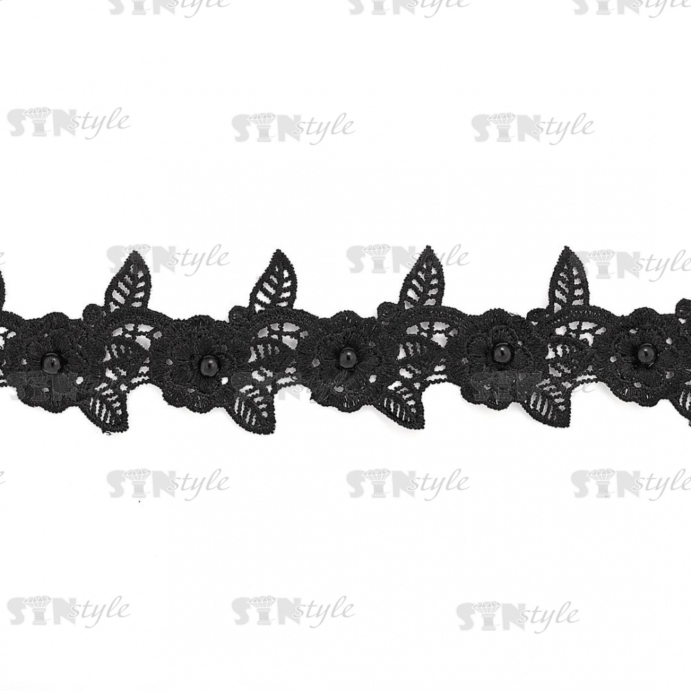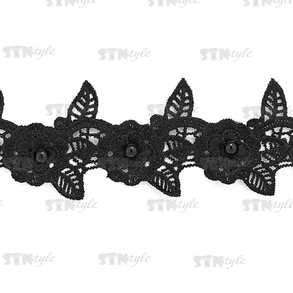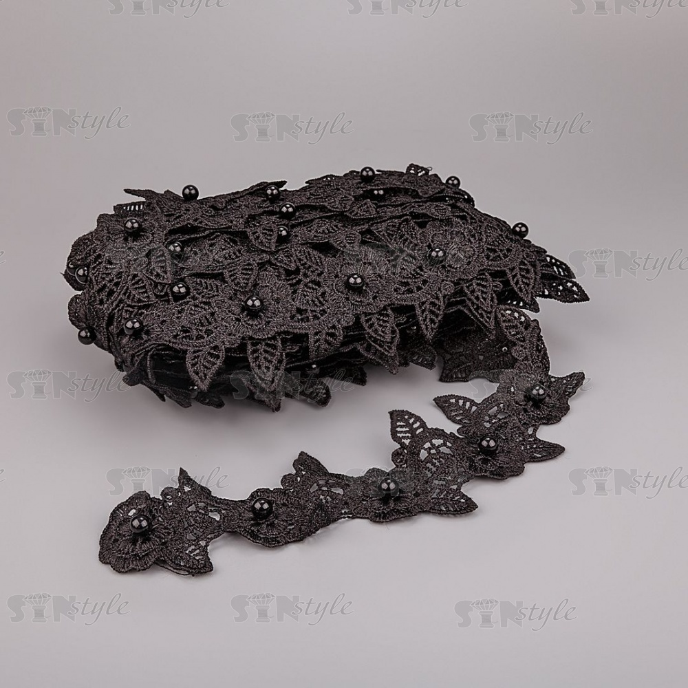 Кружево "Цветочное", на тонкой ажурной основе россыпь объемных цветов с бусиной в середине, ширина 60 мм, цвет черный, намотка 15 ярдов